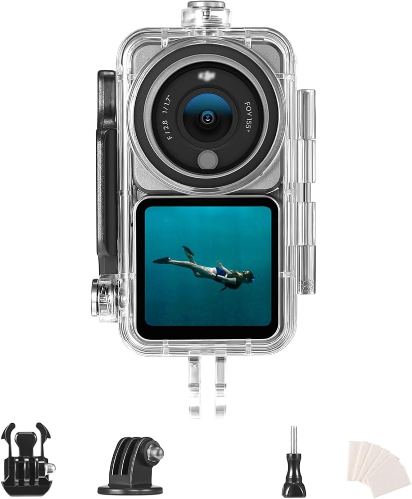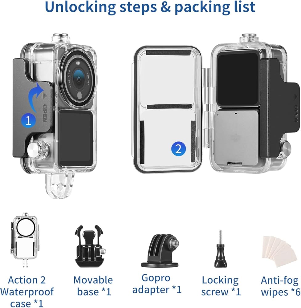 1. عدسة الحافظة المقاومة للماء اكشن 2 مصنوعة من مادة زجاجية عالية النقل للضوء، تحت الماء واضحة وشفافة، يتم استعادة 99% من تأثير الماكينة الحقيقي، ويمكن تصوير المناظر الطبيعية تحت الماء بوضوح.