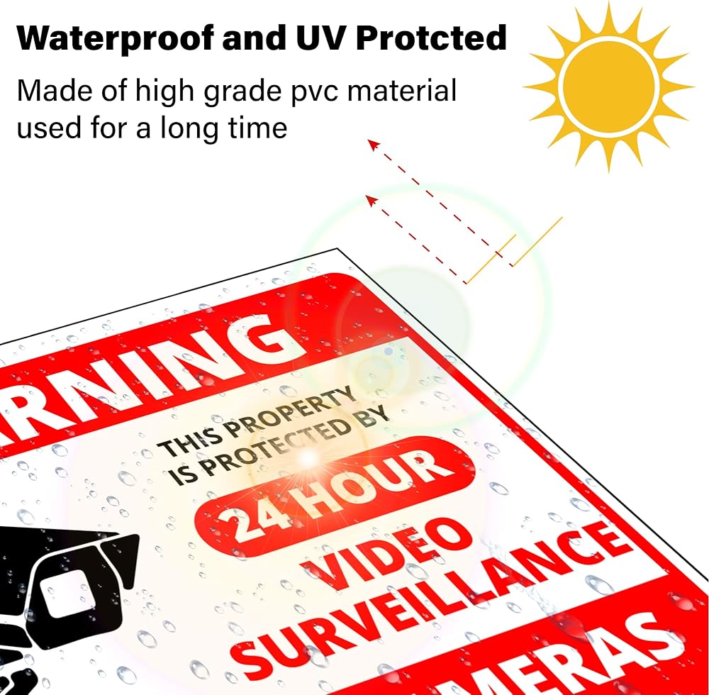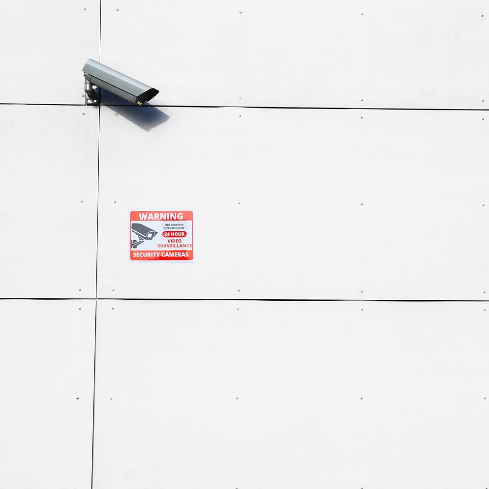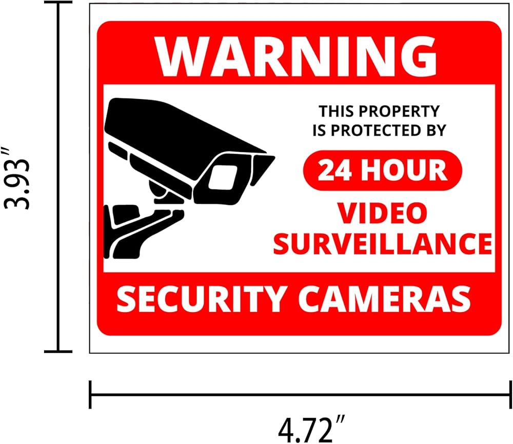 ملصق لافتة الكاميرا - 10 عبوات مقاس 4 بوصة × 4.7 بوصة ملصق مراقبة فيديو لمدة 24 ساعة، محمي من الأشعة فوق البنفسجية ومقاوم للماء، ملصق كاميرا تحذير أمني للاستخدام الداخلي والخارجي