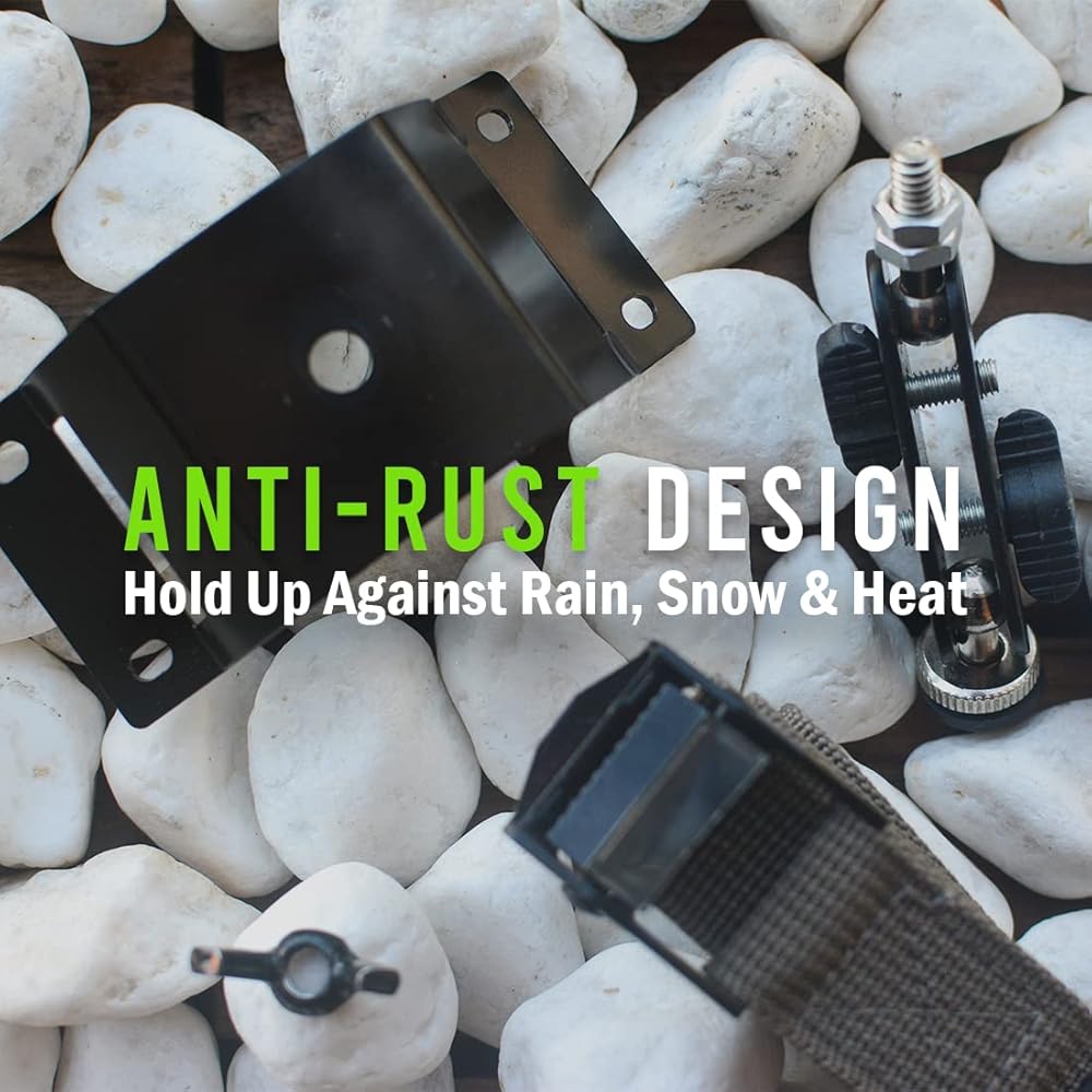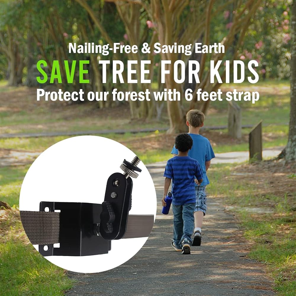 ♻️【Nearly 100% Metal】Our TreeDude mounting bracket body is constructed of alloy steel with rust-resistant black paint. The reliable fasteners and 1” wide nylon strap are designed for long lasting use in various weather conditions. Let you leave the wood with confidence.