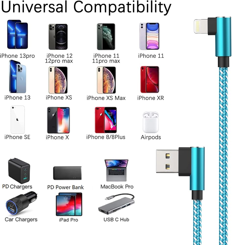 [توافق واسع]: سلك شحن مثالي لهاتف iPhone 12 Pro / 12 mini / SE (الجيل الثاني) / 11 Pro Max / XS / XS Max / XR / X / 8 Plus / 8 / 7 Plus / 7 / 6s Plus / 6s / 6 بلس / 6 / 5s / 5c / 5 / آيباد برو / آيباد إير / إير 2 / آيباد ميني / ميني 2 / ميني 4 / آيباد الجيل الرابع، آيباد (الجيل الرابع)، نانو (الجيل السابع) وتتش (الجيل الخامس) . متوافق مع جميع الأجهزة التي تعمل بنظام iOS11،12