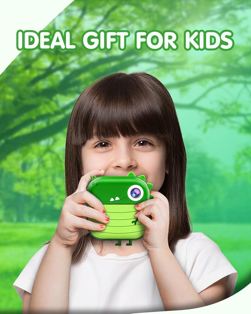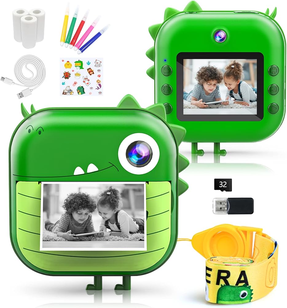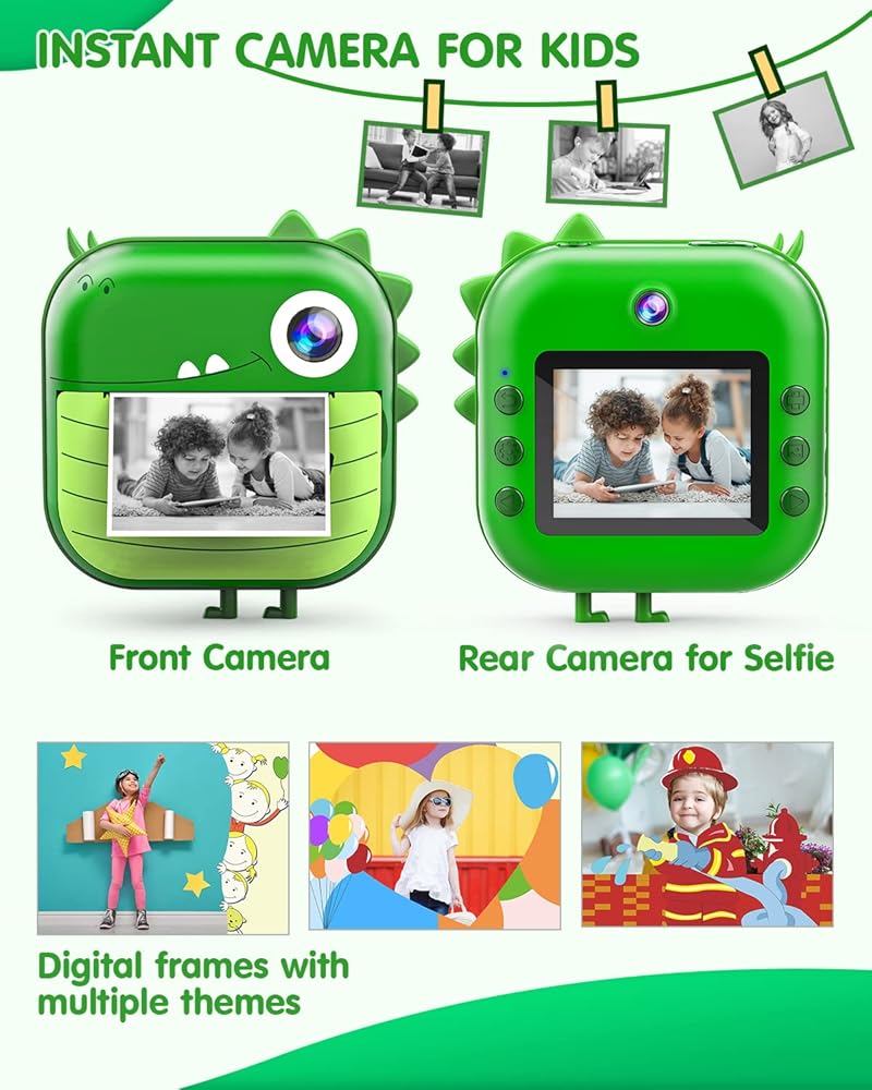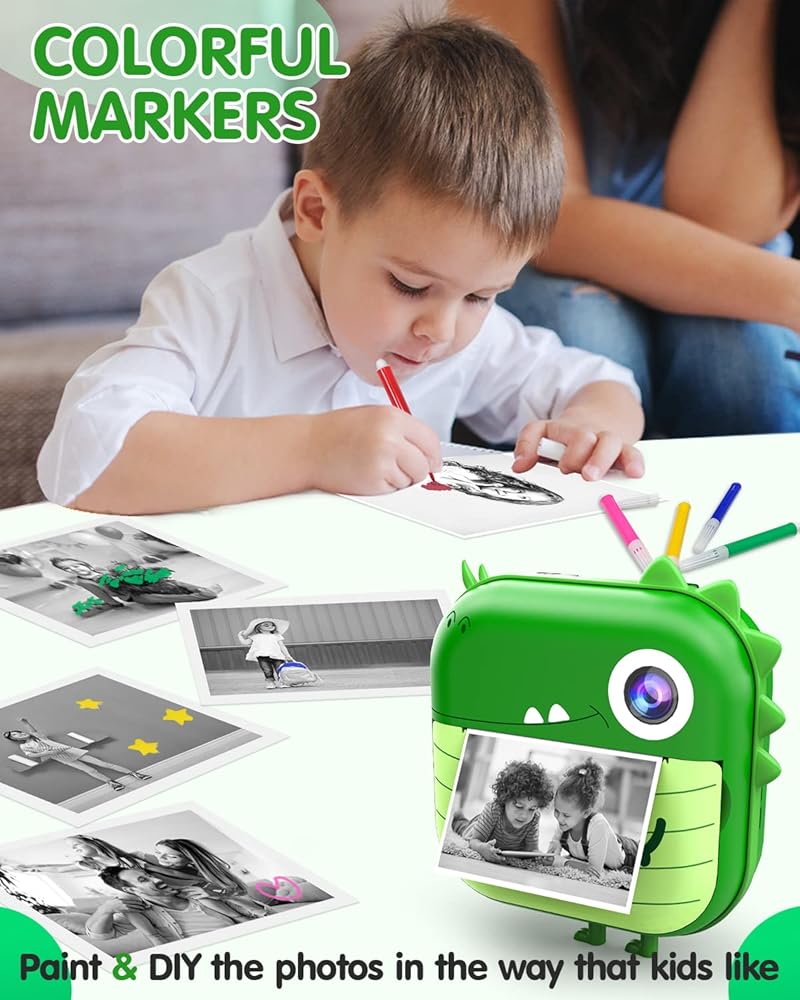 📷كاميرا للأطفال مع طباعة فورية- تتميز كاميرا Kizeefun للأطفال بتصميم ديناصور لطيف وكاميرات أمامية وخلفية عالية الدقة تمكن الأطفال من التقاط الصور وصور السيلفي. تشتمل الكاميرا أيضًا على مجموعة متنوعة من الإطارات الرقمية الممتعة، مثل خلفيات العطلات الرائعة وملصقات الشخصيات وملصقات الحيوانات. بعد التقاط الصورة، يمكن إنتاج نسخة مطبوعة بالأبيض والأسود على الفور، والتي يمكن بعد ذلك تلوينها باستخدام الأقلام الملونة المضمنة.