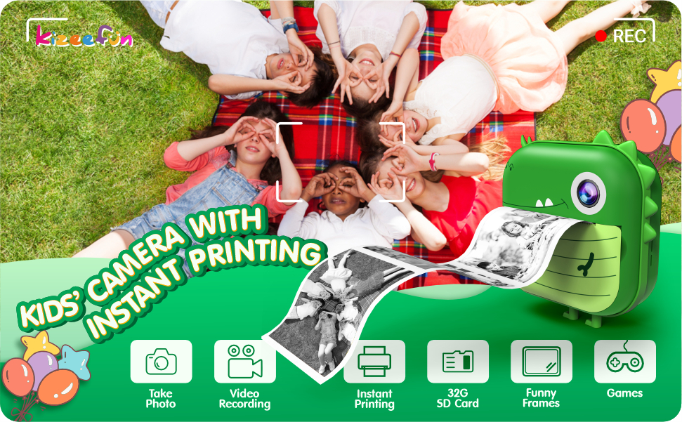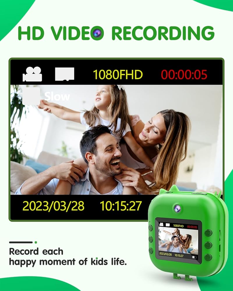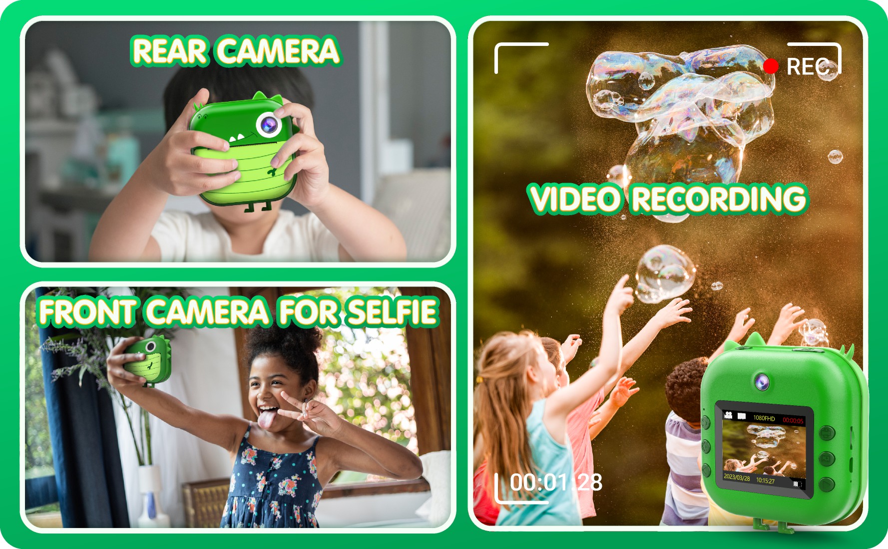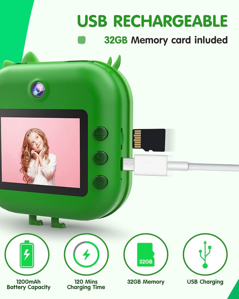 📷كاميرا للأطفال مع طباعة فورية- تتميز كاميرا Kizeefun للأطفال بتصميم ديناصور لطيف وكاميرات أمامية وخلفية عالية الدقة تمكن الأطفال من التقاط الصور وصور السيلفي. تشتمل الكاميرا أيضًا على مجموعة متنوعة من الإطارات الرقمية الممتعة، مثل خلفيات العطلات الرائعة وملصقات الشخصيات وملصقات الحيوانات. بعد التقاط الصورة، يمكن إنتاج نسخة مطبوعة بالأبيض والأسود على الفور، والتي يمكن بعد ذلك تلوينها باستخدام الأقلام الملونة المضمنة.