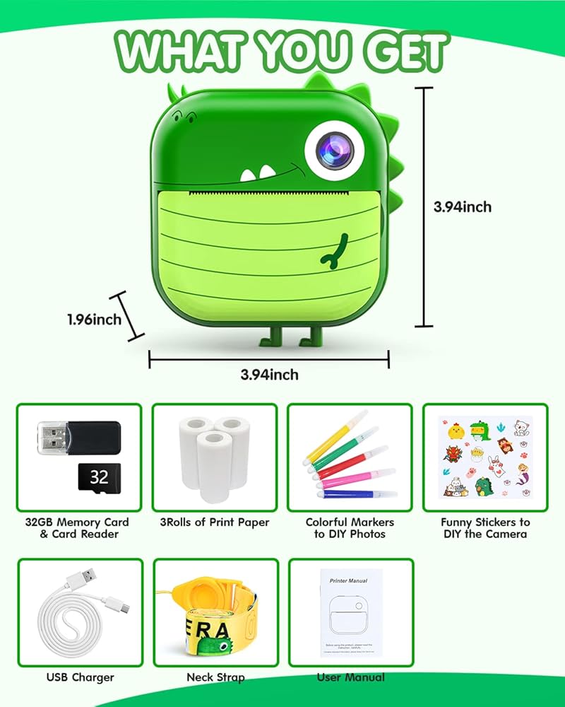 🦖ما تحصل عليه - تتضمن هذه الحزمة كاميرا فورية بطابع الديناصورات، وبطاقة SD سعة 32 جيجابايت، وقارئ لتخزين مجموعة كبيرة من الصور ومقاطع الفيديو الخاصة بطفلك الصغير، وثلاث لفات من ورق الطباعة، وخمسة أقلام تلوين ملونة لإضافة لمسة شخصية إلى مطبوعات بالأبيض والأسود، وورقة واحدة من الملصقات للديكور الذي يمكنك صنعه بنفسك، وحزام لتعليق الكاميرا حول رقبة طفلك، وكابل شحن USB واحد، ودليل التعليمات.