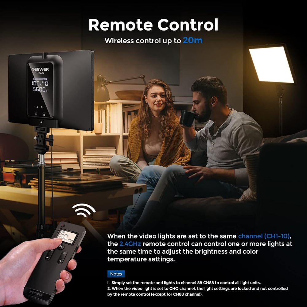 【2.4G Wireless Remote】 The 2.4G wireless remote control can easily adjust brightness, channels, and color temperature within 65.6' (20m). Designed with 11 channels (1-10 and "88"), this remote allows you to control one or multiple T140 lights at the same time by setting the channel at "88" and to achieve more creative effects
