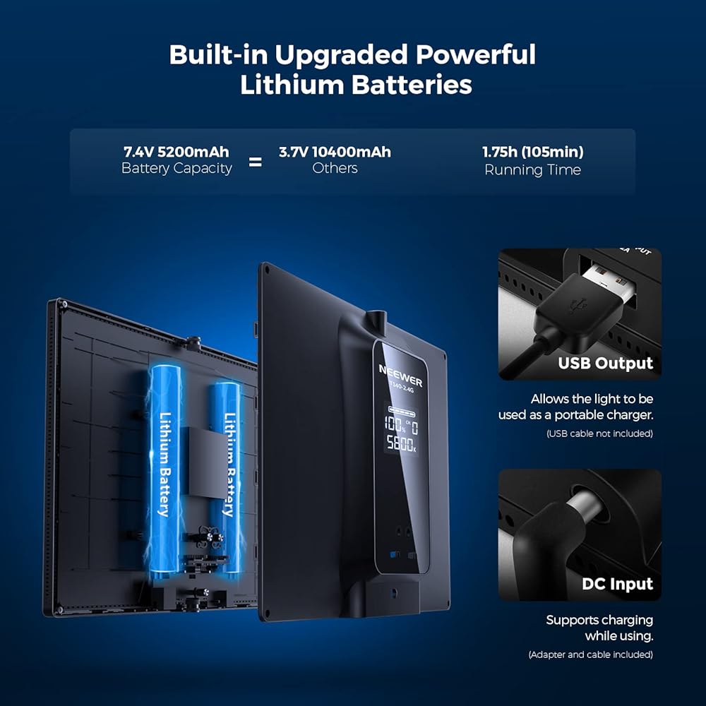 【Built In Lithium Battery & USB Port】 A built in 7.4V 5200mAh (equals to 3.7v 10400mah) battery can help you shoot in places where wall plugs are unavailable and provide up to 105 minutes (1.75h) of continuous lighting at maximum brightness after fully charged. You can also power the light with the included power adapter. A 5V/2A USB output port can be used to charge a mobile device