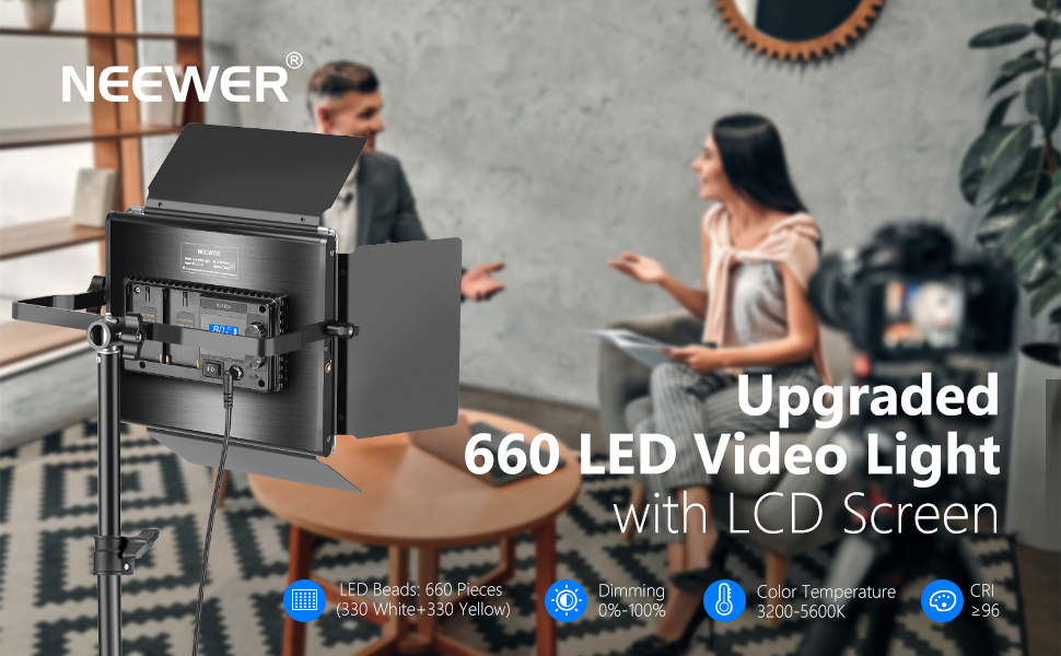 نيوير مصباح فيديو LED مطور 660، قابل للتعتيم ثنائي اللون 3200-5600 كلفن سي ار اي 96+ مع شاشة LCD، دعامة تثبيت على شكل حرف U ودور للتصوير الفوتوغرافي في الاستوديو وتصوير فيديو يوتيوب (NL660S)
