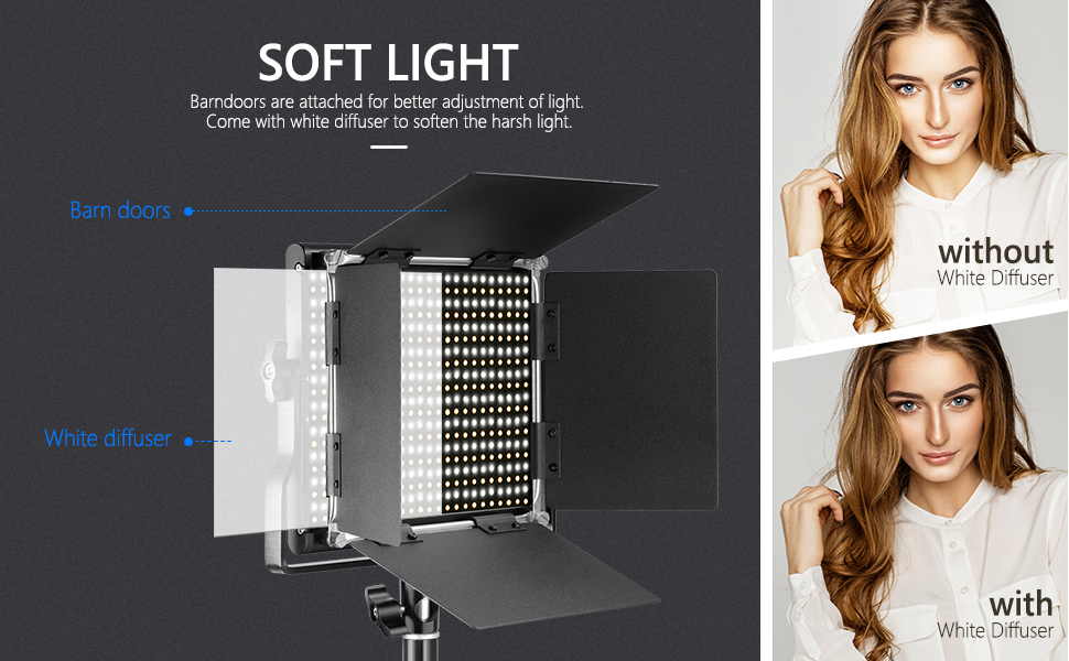 330 مصباح أبيض دافئ و330 خرزة LED بيضاء باردة توفر درجات حرارة ألوان قابلة للتعديل من 3200 كلفن إلى 5600 كلفن ومستويات سطوع من 0 إلى 100%. موزع أبيض يجعل مصدر الضوء متوازنًا وناعمًا ومبهجًا للعينين