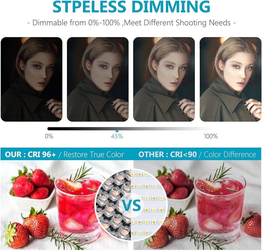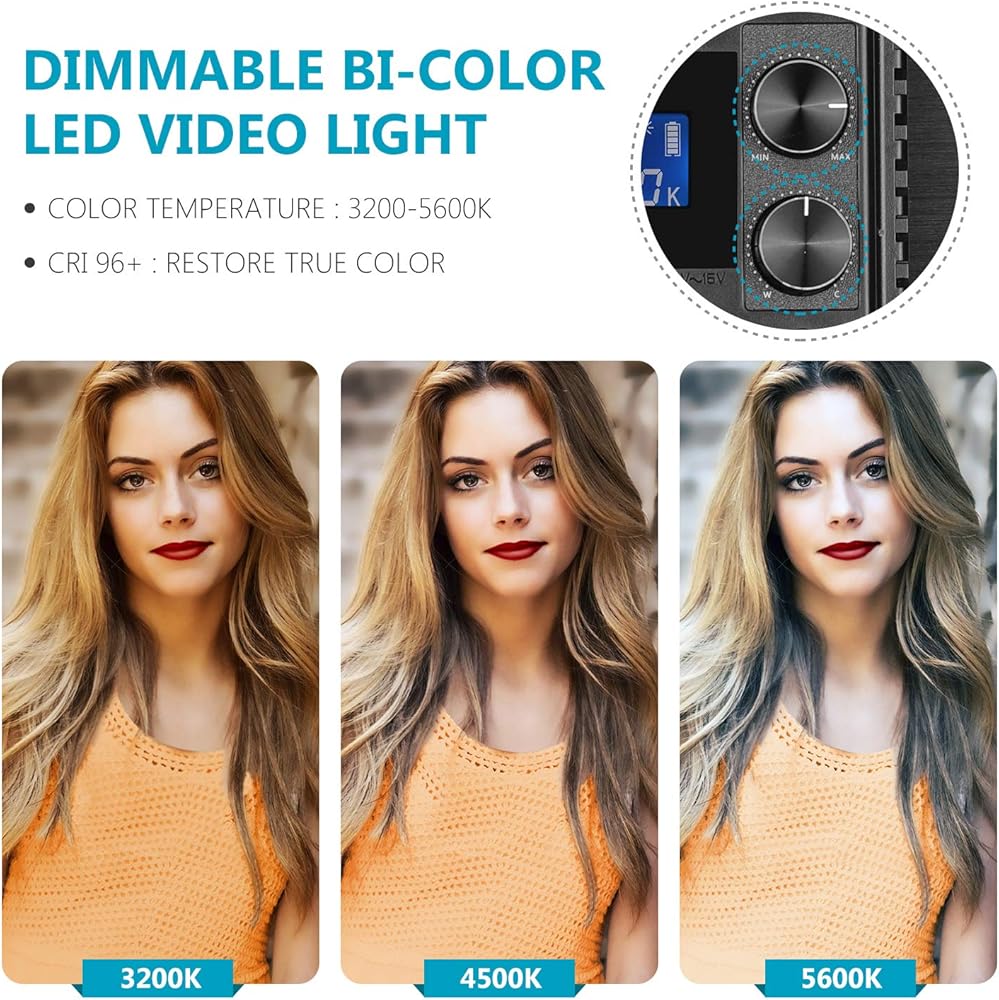 【قابل للتعتيم وثنائي اللون】 330 مصباح LED أبيض و330 مصباح LED أصفر يوفر درجة حرارة اللون من التنجستن إلى ضوء النهار (3200 كلفن إلى 5600 كلفن) ونطاق تعتيم كامل من 0 إلى 100%. مقبضان يجعلانك تضبط الإعدادات بسرعة ودقة. يضمن سي ار اي 96+ العالي إعادة إنتاج الألوان الصادقة ونتائج مقنعة