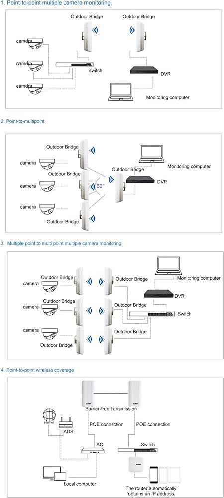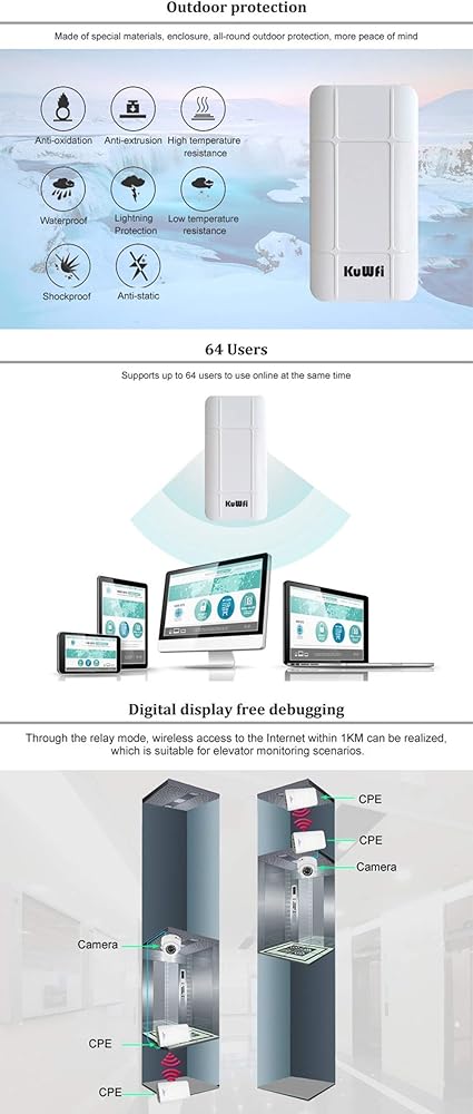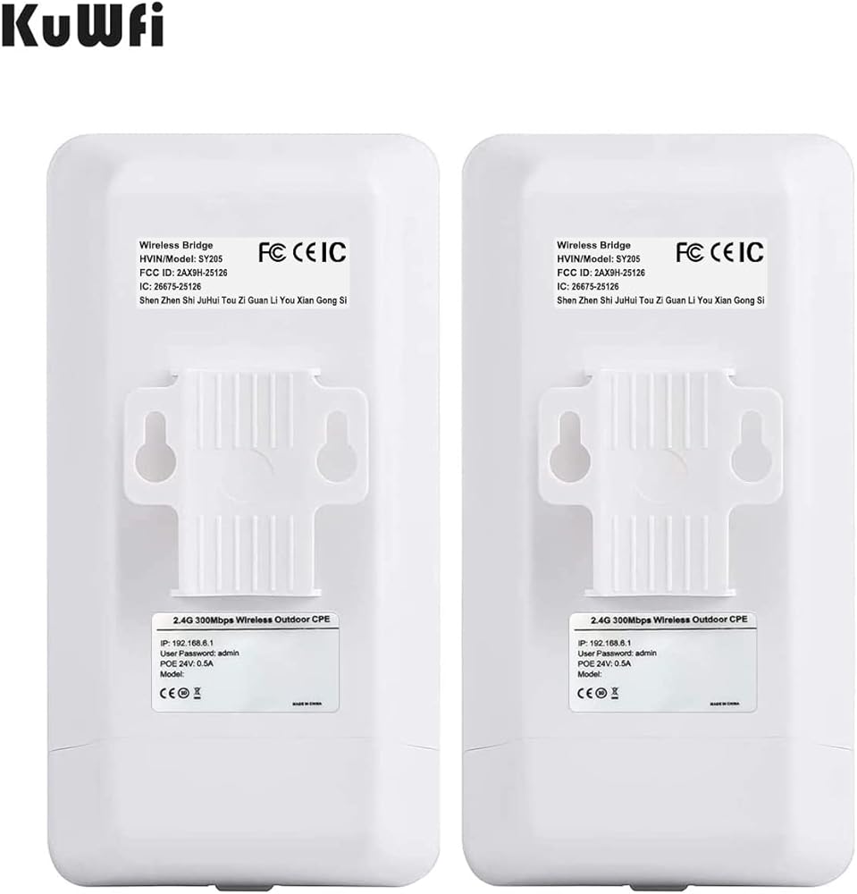 KuWFi SY205 Wireless Bridge Kit عبارة عن CPE/AP خارجي اقتصادي بمعدل بيانات 300 ميجابت في الثانية. يتوافق مع معيار IEEE 802.11b/g/n، ويعتمد مجموعة شرائح Qualcomm QCA9531، تركيب بسيط للغاية، طقم cpe خارجي لاسلكي SY205 مع تكوين مسبق، جاهز للتثبيت. ومع إدارة الويب الذكية، يمكن الاقتران تلقائيًا. حل فعال لتطبيق PTP وPTMP وتغطية واي فاي طويلة المدى في الهواء الطلق وسهل ضبط CPE مع كاميرا IP (الكاميرات) والشبكات DVR يدعم أيضًا غطاء واي فاي طويل المدى