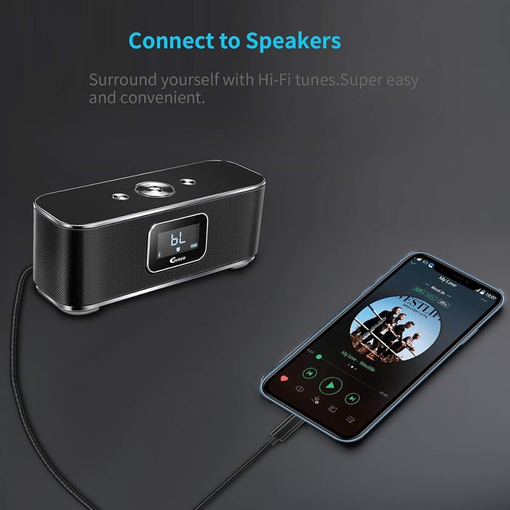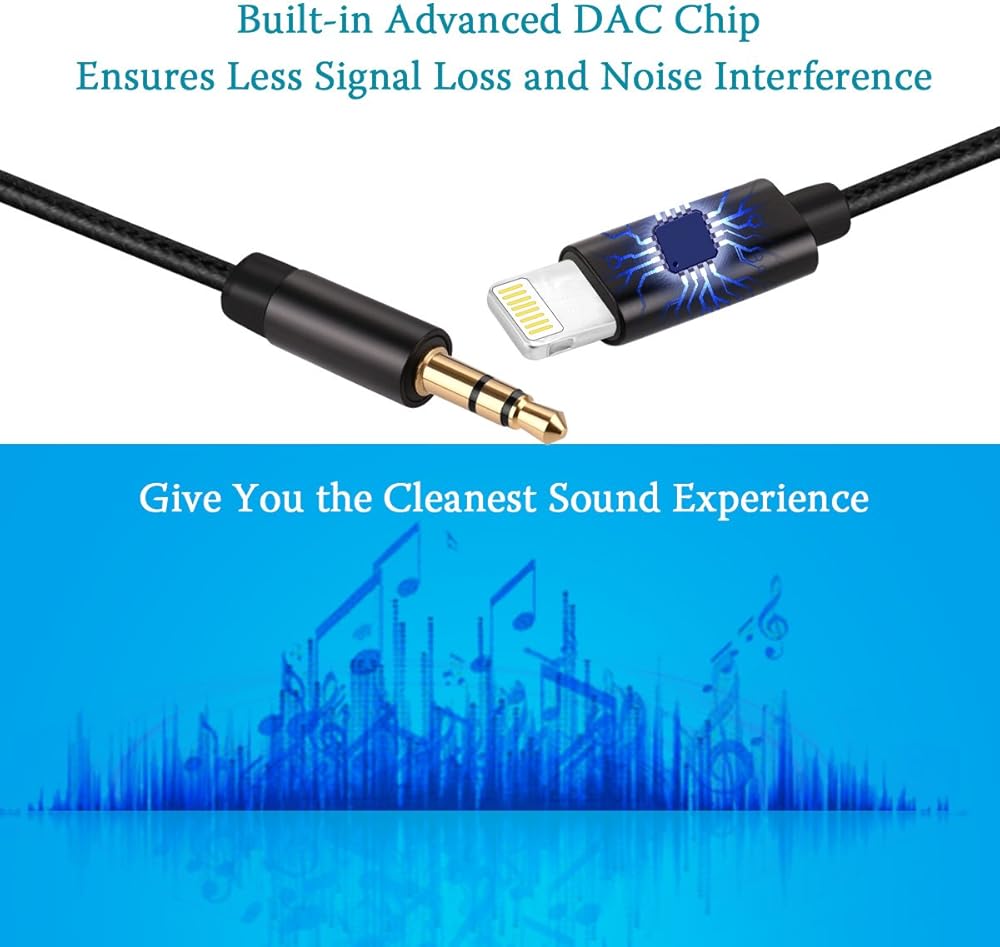 【Premium Sound Quality】This aux stereo cable is well-made of dual-shielding, corrosion-resistant 24K gold-plated 3.5mm connectors. that guarantees less signal loss and noise interference. With the advanced DAC Chip, this Lightning to 3.5mm Aux Cord ensures the cleanest and most crystal sound quality while using the 3.5mm Jack cable at home or driving