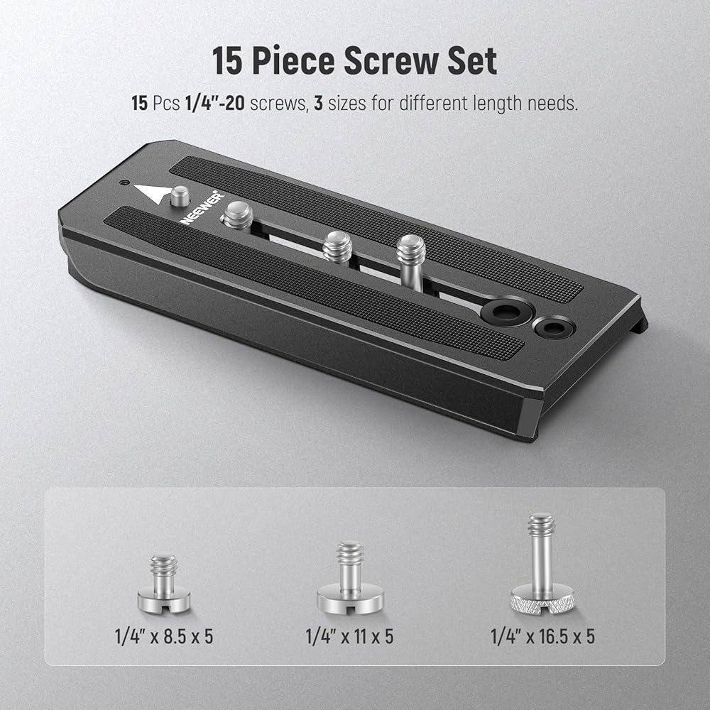 【Quick Release Replacement Screw】 Securely mount your camera on the quick release plate with the 1/4'' slotted screw kit. The 1/4" screws in 3 different sizes with 5 pcs each including 16.5mm (5mm threaded, 11.5mm unthreaded), 11mm (5mm threaded, 6mm unthreaded), and 8.5mm (4.5mm threaded, 5mm unthreaded), for any size and extra quantity for your quick release needs