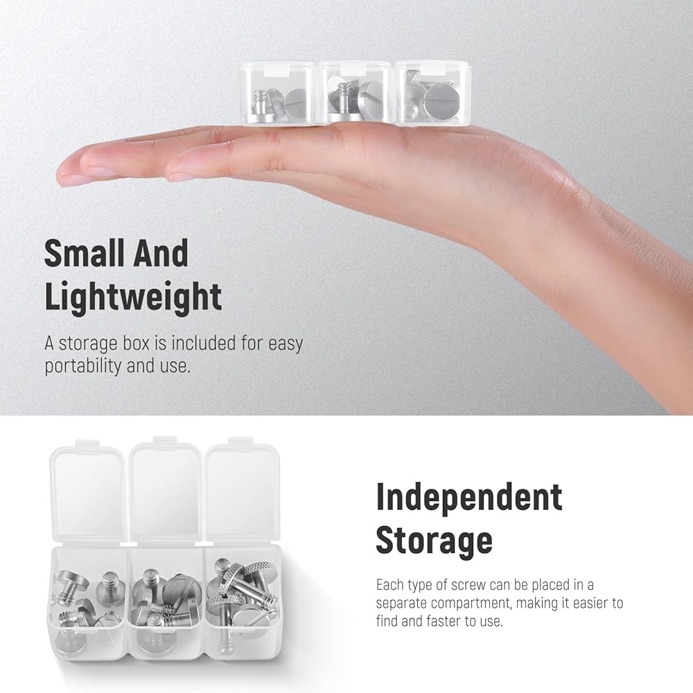 【Easy to Use & Carry】 Simply insert the screw into the central slot on the quick release plate and tighten by hand or rotate with a flathead screwdriver (not included) to firmly secured on the plate for further quick release uses. 3 included small screw storage cases for easy carrying and organization