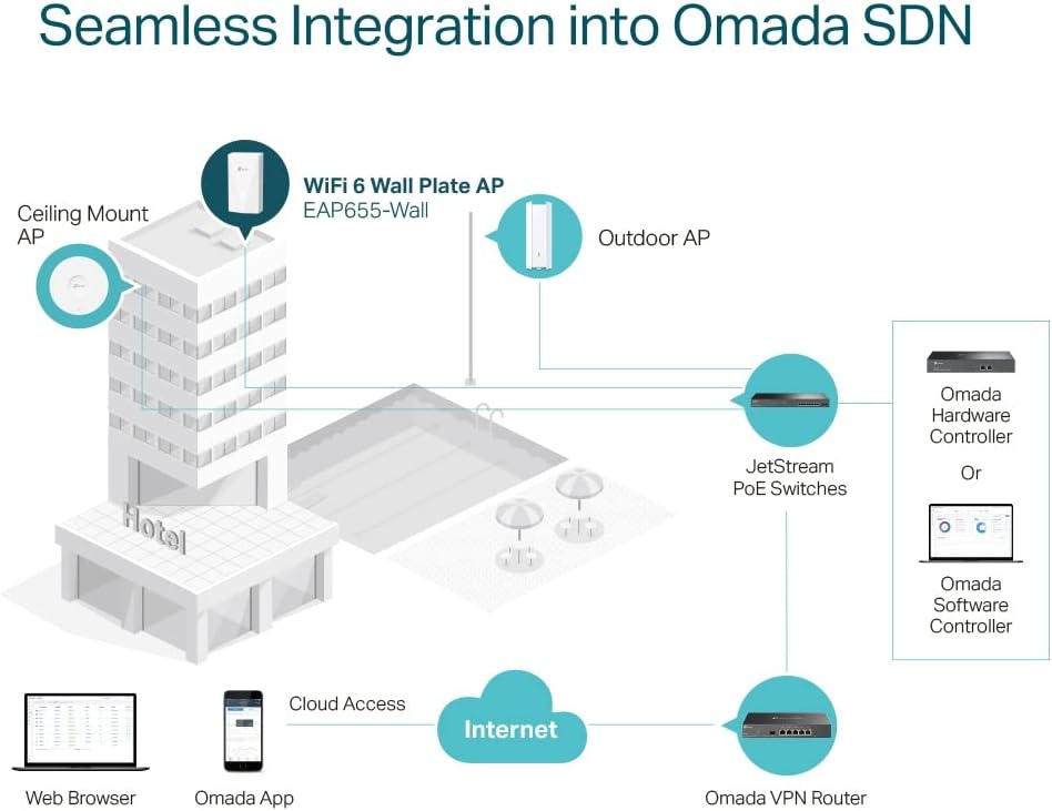 【مدمج في Omada SDN】تدمج منصة الشبكات المعرفة بالبرمجيات (SDN) من Omada أجهزة الشبكة بما في ذلك نقاط الوصول والمفاتيح والبوابات مع خيارات التحكم المتعددة المقدمة - وحدة تحكم أجهزة Omada أو وحدة تحكم برامج Omada أو وحدة التحكم المستندة إلى السحابة Omada* (اتصل بـ TP-Link لـ تفاصيل خطة التحكم المستندة إلى السحابة). ينطبق الوضع المستقل أيضًا.