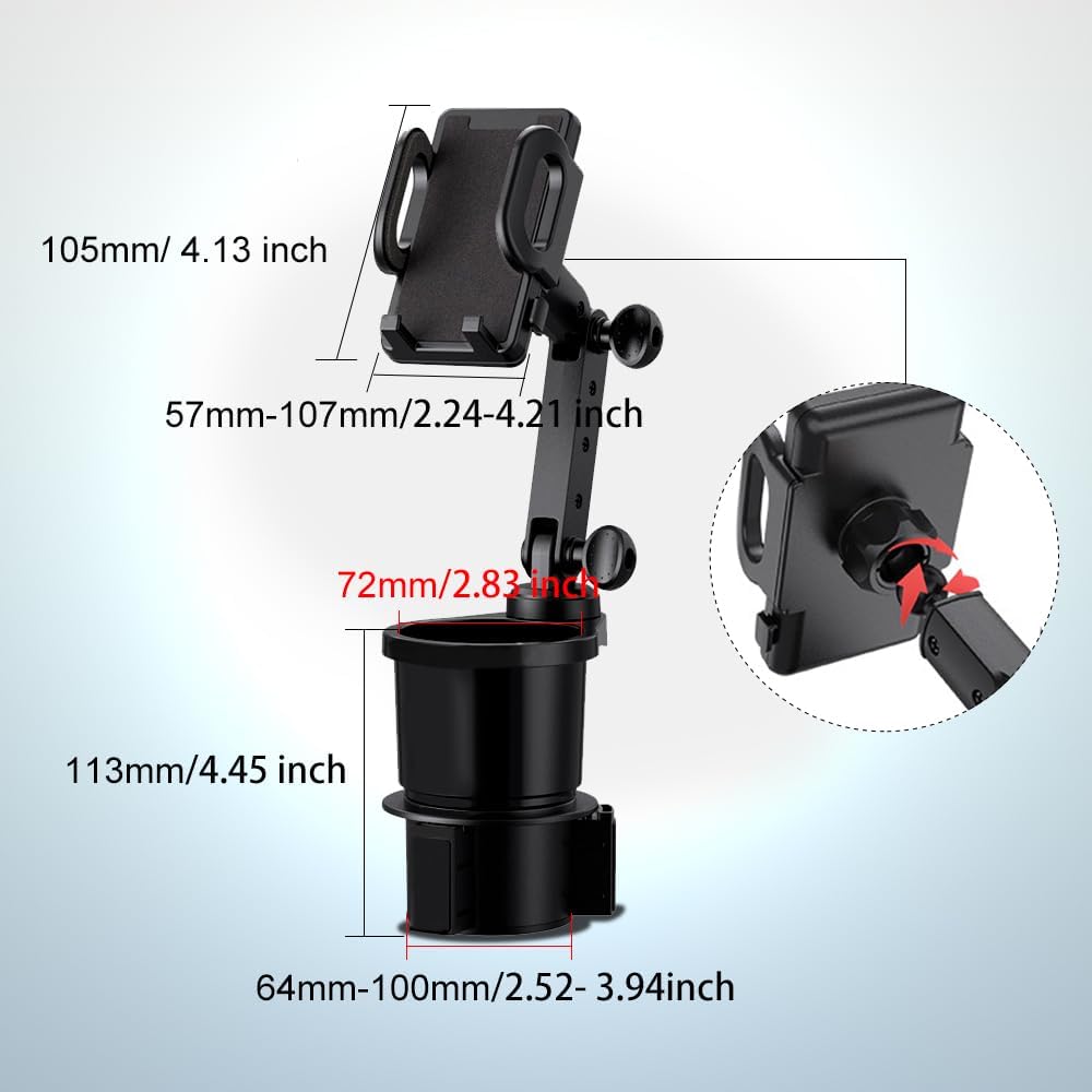 [Suitable size]: This 2 in 1 Car Cup Extender can hold all types of smartphones, ranging in width from 5.7-10.7CM, the phone stand long is 10.5 CM, the diameter of the mouth is 7.2CM. The water cup holder can hold the water cup between 6.4-10 CM in diameter, and the height of cup is 11.3 CM.