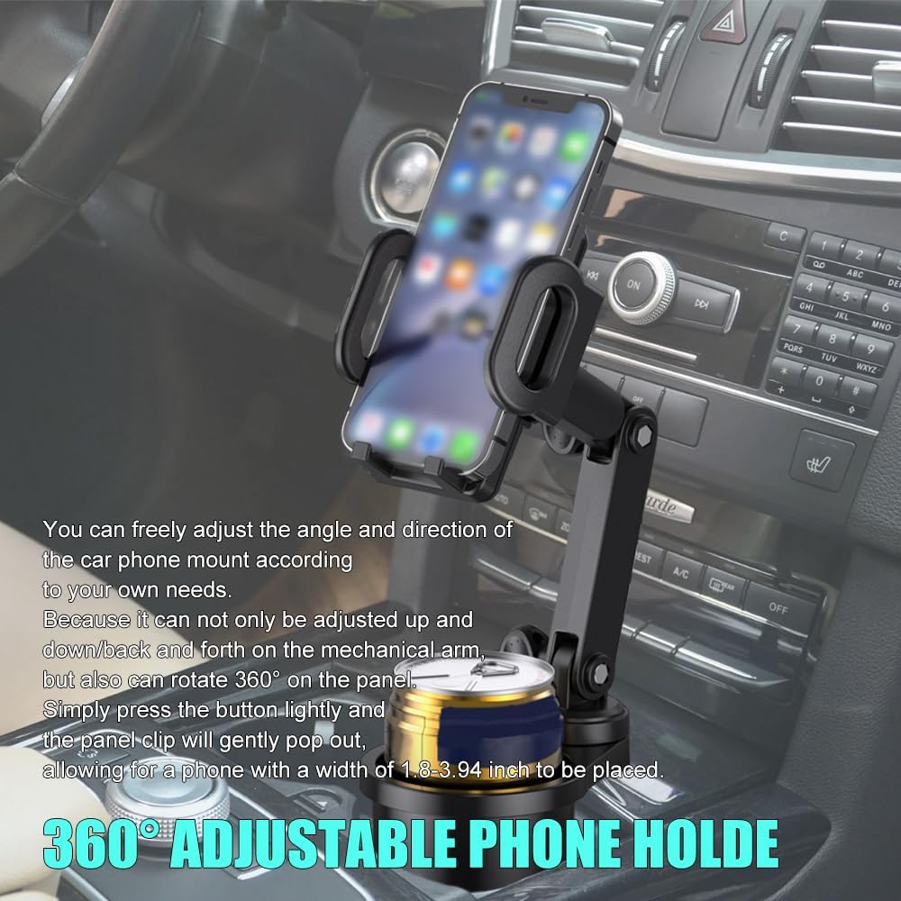 [Easy to instal]l: This Mobile Phone Holder Drink Adapter is simple to install, first you need to insert the product base into the car cup holder, rotate the cup holder, push out the support block, and fix the base. Press the small button on the right side of the phone stand to plug and play. It should be noted that this cup holder is suitable for mounting on a round base, please carefully measure the size of your car's cup holder base before buying.