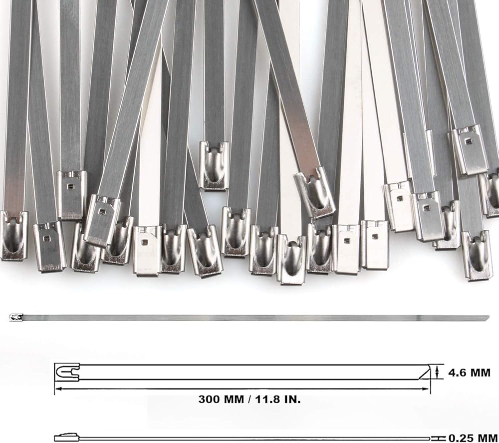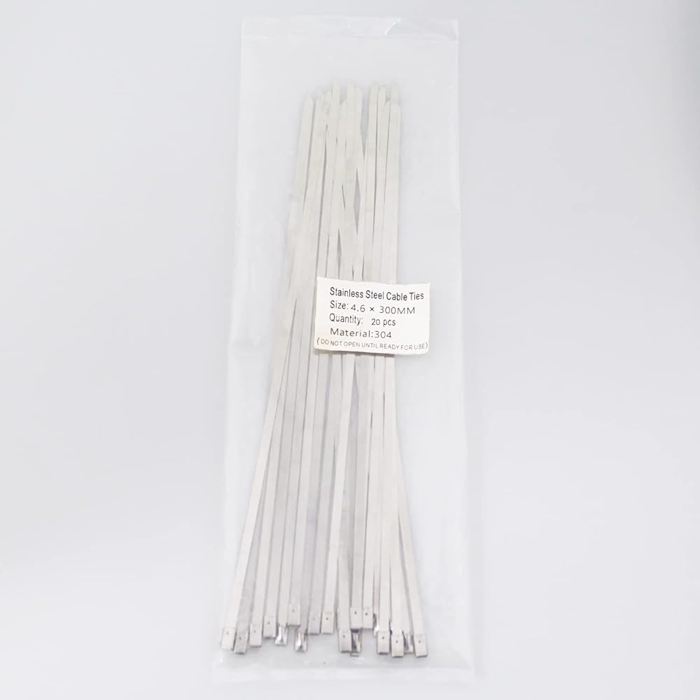 الطول: 300 ملم/11.8 بوصة. العرض: 4.6 ملم/0.18 انش. السماكة: 0.25 ملم/0.01 بوصة. 20 قطعة من ربطات معدنية بسحاب معبأة في أكياس محكمة الغلق