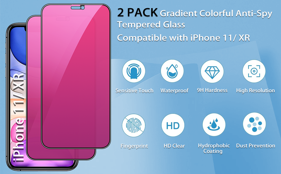 • 【متوافق مع هاتف iPhone 11/ XR】 عبوتان من واقي شاشة الخصوصية iPhone 11/ XR، على عكس واقي شاشة الخصوصية الأسود، سيتغير لوننا من الأزرق إلى الأرجواني بزوايا مختلفة، مما يجعل لون هاتفك قابلاً للتغيير ورائعًا.