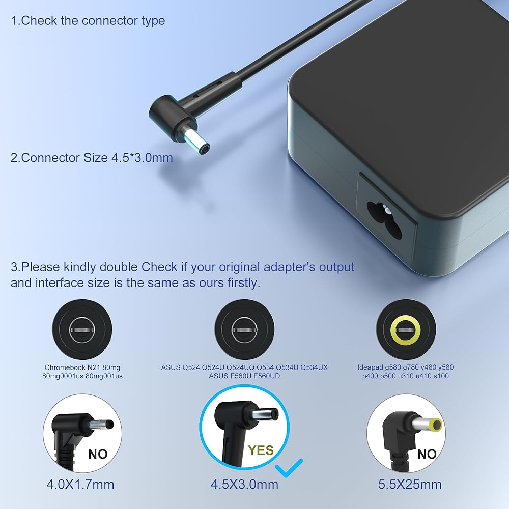 الإدخال: 100 - 240 فولت 50-60 هرتز الإخراج: 19 فولت 4.74 أمبير 90 واط القطر: 4.5*3.0 مللي متر