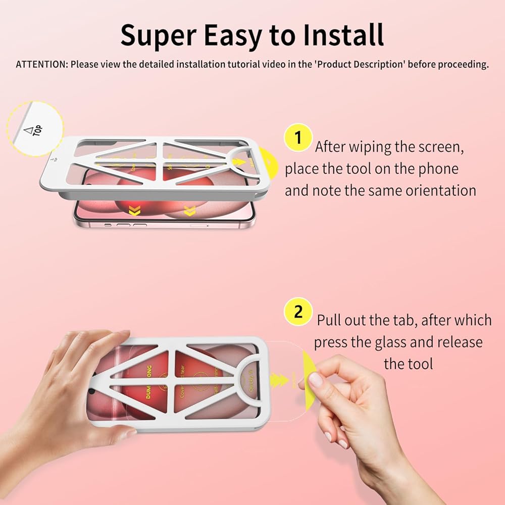 📱تركيب سهل الانزلاق لمدة ثانية واحدة: يأتي واقي DUMOSONG لهاتف iPhone 15 plus مع مجموعة محاذاة تلقائية لمساعدتك على القيام بتثبيت سريع وخالي من الغبار والفقاعات لواقي الشاشة الزجاجي. يؤدي الإطار المقدم إلى تثبيت مثالي خالٍ من الغبار في المحاولة الأولى وفقًا للتعليمات. إذا كانت هناك بعض الفقاعات الصغيرة بعد التثبيت، فيمكنك نقلها إلى الحافة. يرجى الانتباه إلى التعليمات أو الفيديو بعناية قبل التثبيت