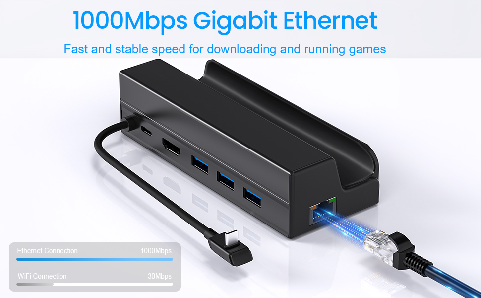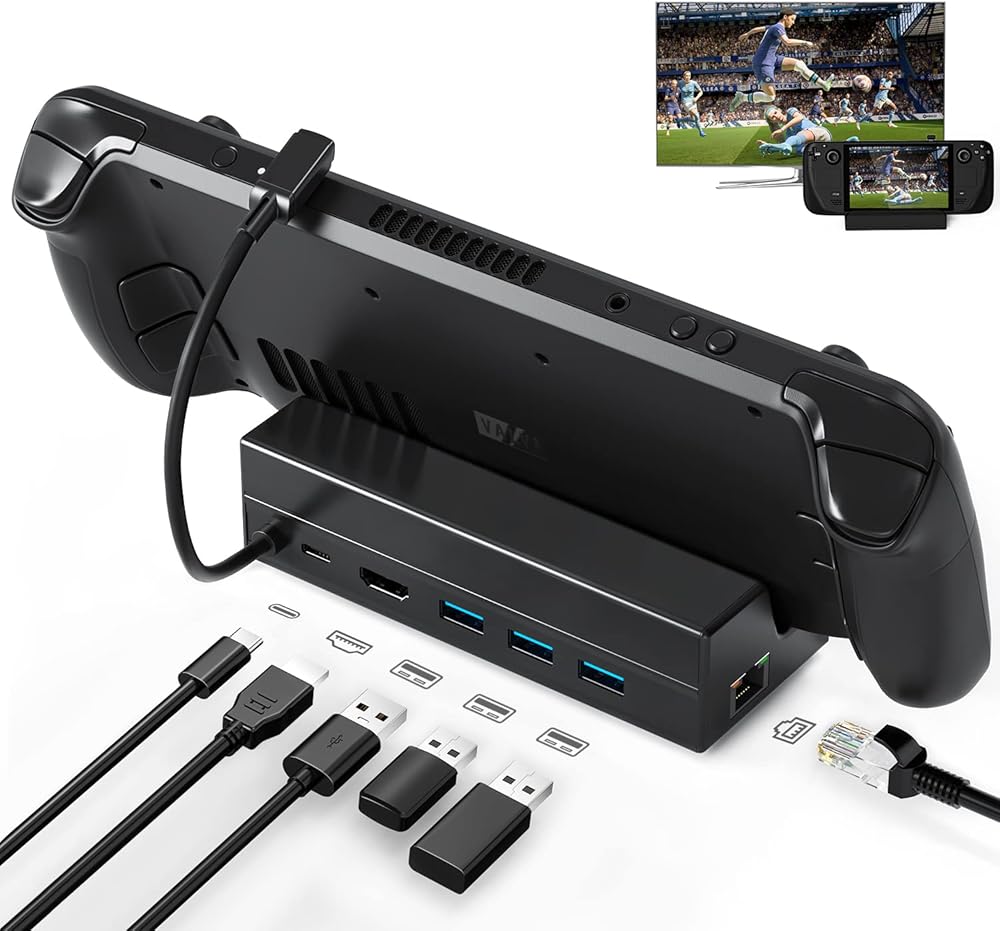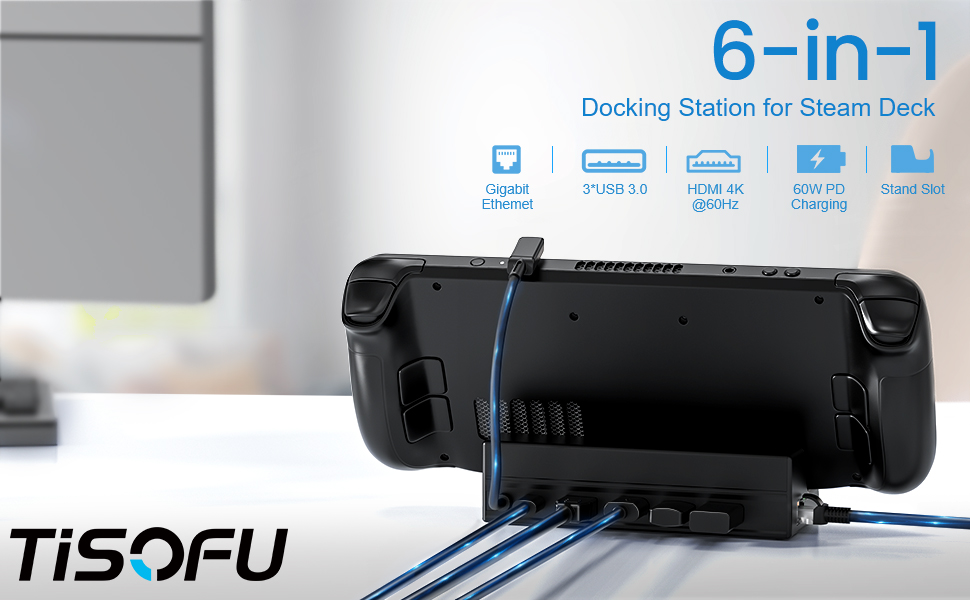 قاعدة شحن 6 في 1 لسطح ستيم: تم تجهيز قاعدة قاعدة ستيم ديك بمخرج HDMI 4K ومدخل جيجابت ايثرنت 1000 ميجابت في الثانية (يدعم أيضًا 10 ميجابت في الثانية و100 ميجابت في الثانية و1000 ميجابت في الثانية) و3 منافذ USB 3.0 ومنفذ شحن سريع USB نوع C بي دي.