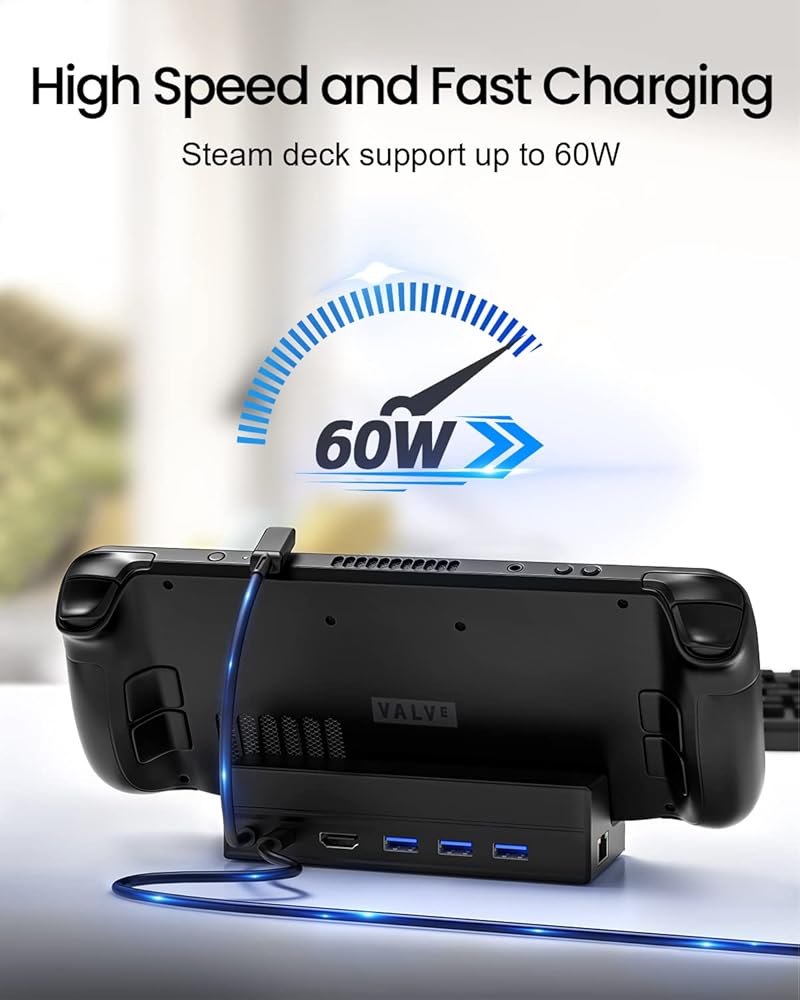 شحن كامل السرعة: تدعم قواعد البث هذه شحن PD-IN بحد أقصى 60 واط، وهو ما يكفي لشحن جهاز ستيم ديك بأقصى سرعة عند إقرانه بالشاحن الأصلي. وبدلاً من ذلك، فإن جهاز ستيم ديك له سرعة شحن قصوى تبلغ 60 واط.