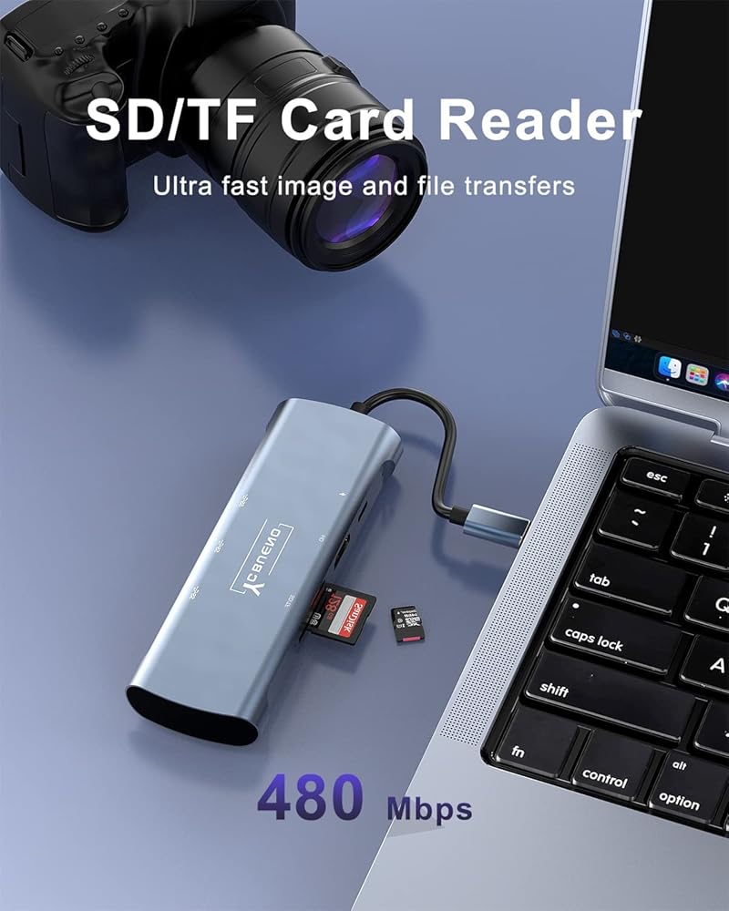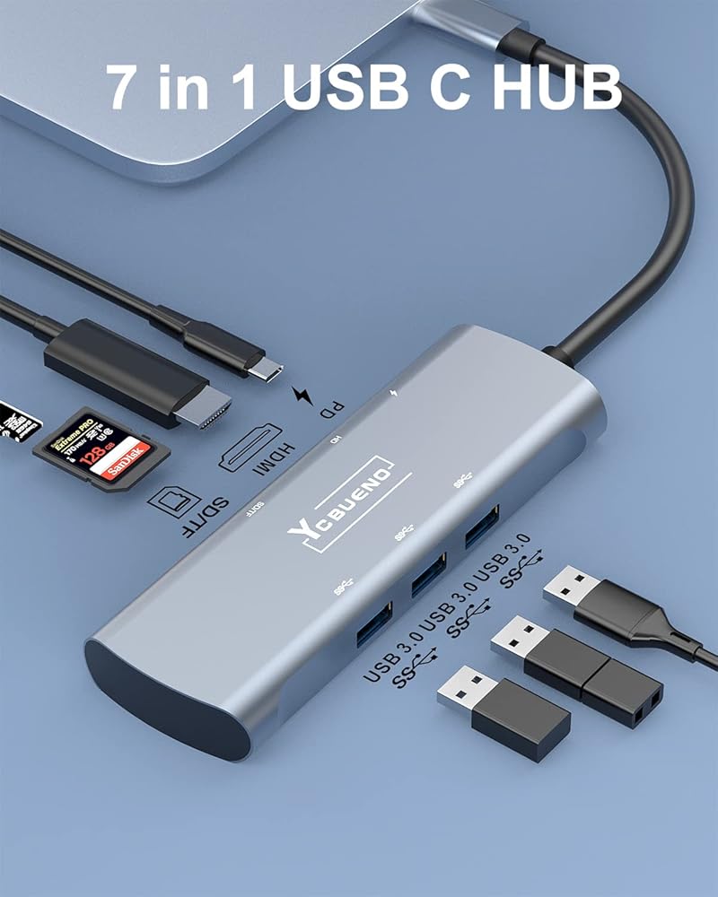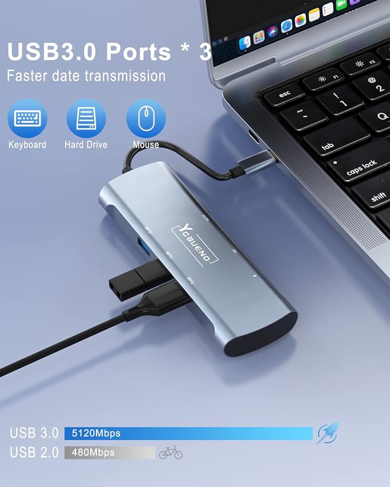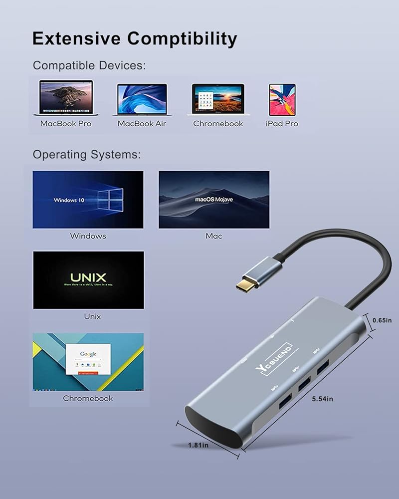 【9-in-1 USB C Hub】Plug and play, Easy to Use, NO additional driver required. USB-C devices with the multiport USB-C hub featuring, 4K@30Hz HDMI port, 3 USB 3.0, 1000M Stable Gigabit Ethernet, 100W PD charging port, SD/TF card reader, 3.5mm Audio interface.