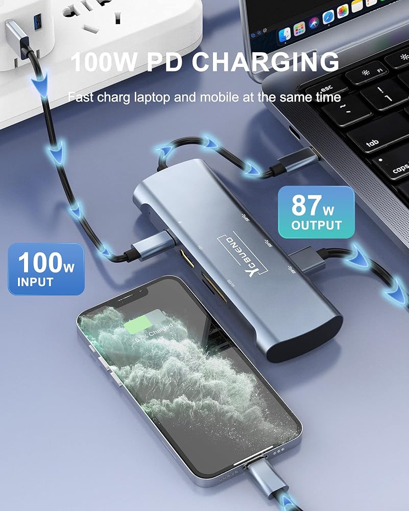 【100W Power Delivery】Connect a 100W Power Delivery charger to the USB-C port to give your laptop a continuous charge 87W max while downlink data transferring files or streaming media.