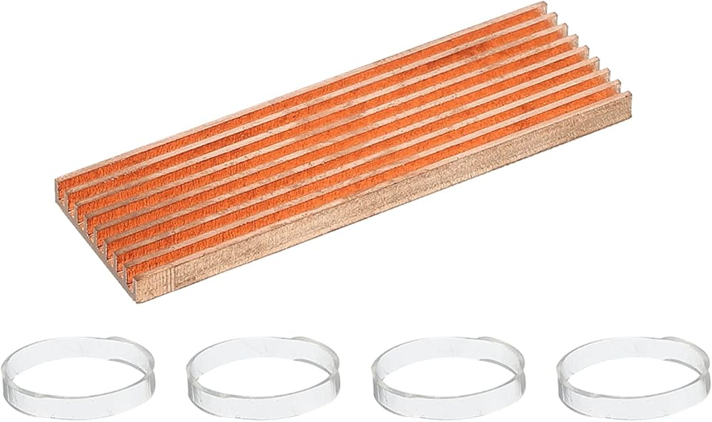 Material: Pure copper; Heatsink Size: 70 x 21 x 4mm/2.83 x 0.87 x 0.16inch; In the package of: 1 x M.2 heatsink; 4 x Rubber Rings; 1 x Self-Adhesive Tape(without function of conductive).