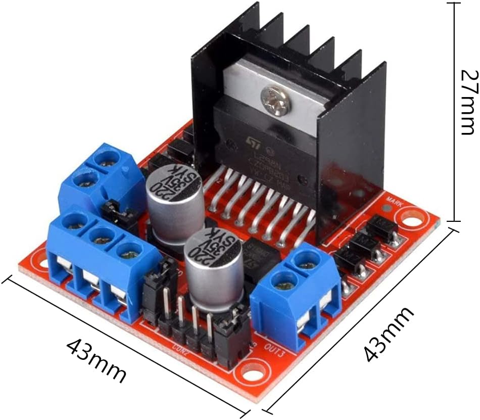 • وحدة محرك المحرك L298N هذه هي وحدة محرك عالية الطاقة لقيادة محركات التيار المستمر والمحركات الخطوية. تتكون الوحدة من محرك IC L298 ومنظم 78M05 5 فولت. يستخدم مقياس H للتحكم بسهولة في اتجاه وسرعة ما يصل إلى محركين تيار مستمر