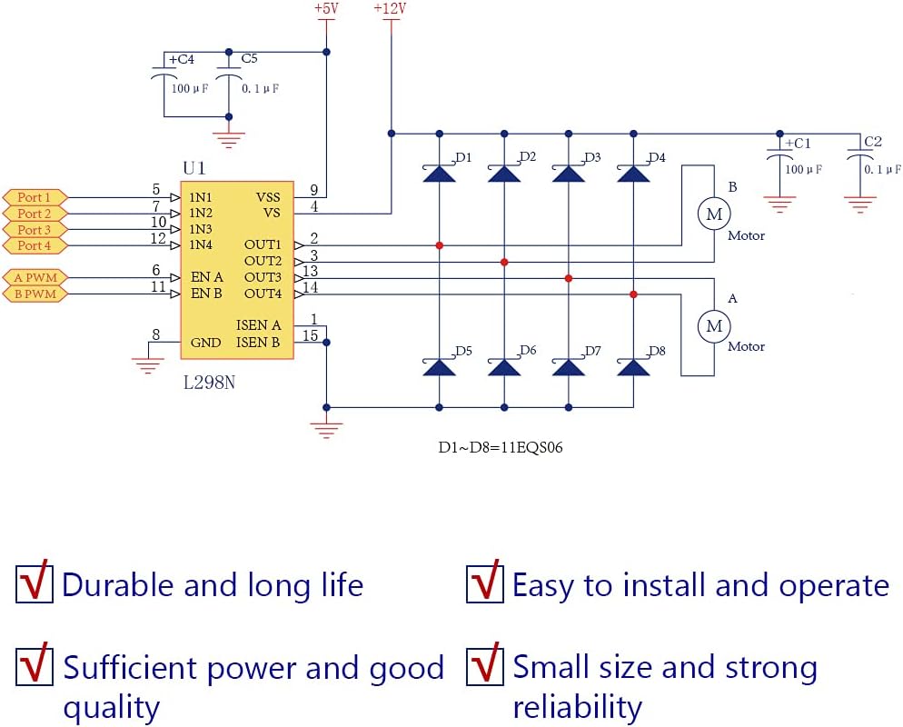 • يستخدم L298N المستخدم في هذه الوحدة كشريحة تعريف، والتي تتميز بخصائص قدرة القيادة القوية وتوليد الحرارة المنخفضة وقدرة قوية على منع التداخل