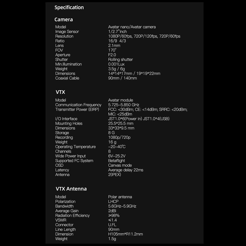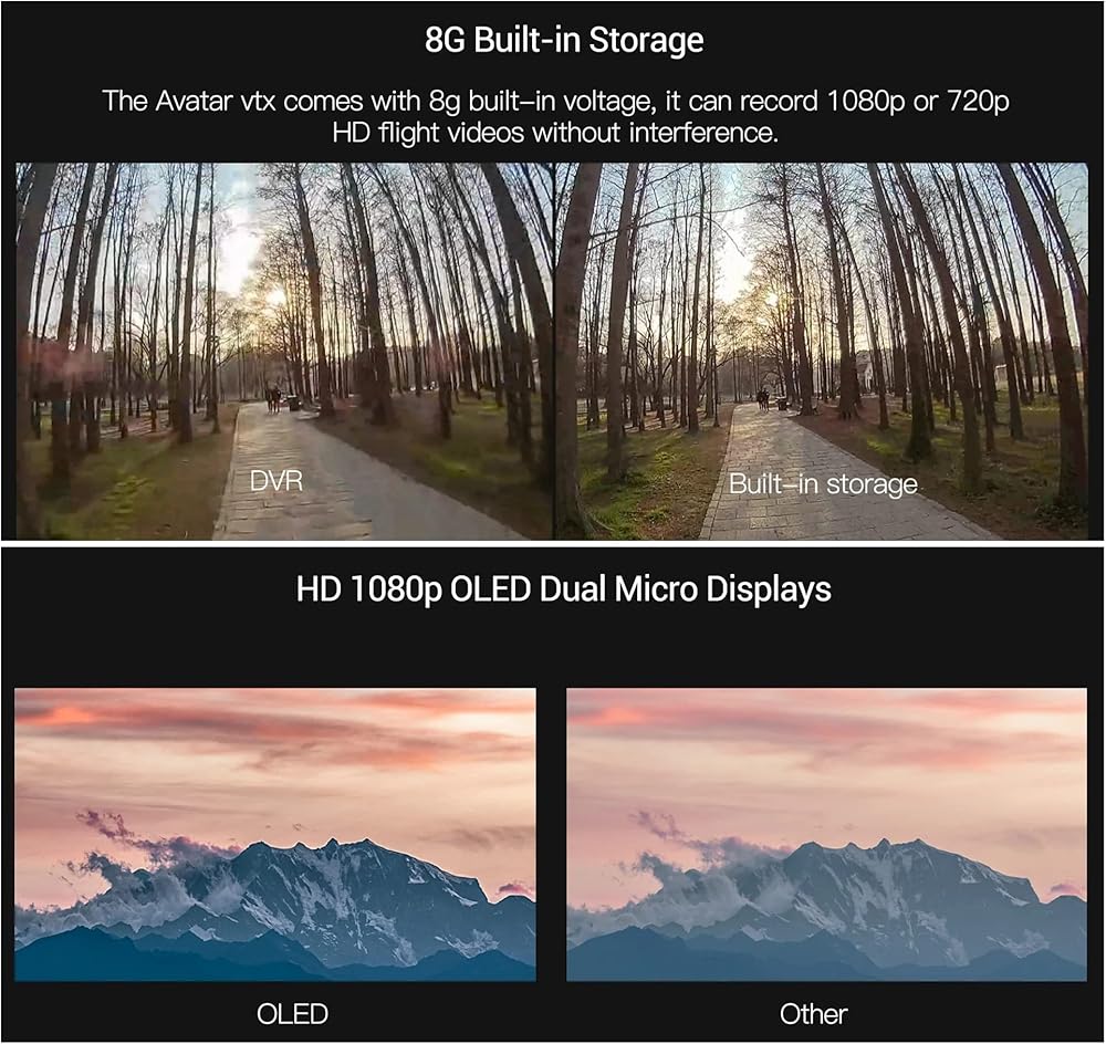 1080p/60fpv، 720p/120fps: يستخدم نظام افاتار اتش دي كود H.265، وهي تقنية رائدة في الصناعة، لتوفير جودة صورة منظور الشخص الأول 1080p مع زمن انتقال منخفض للغاية