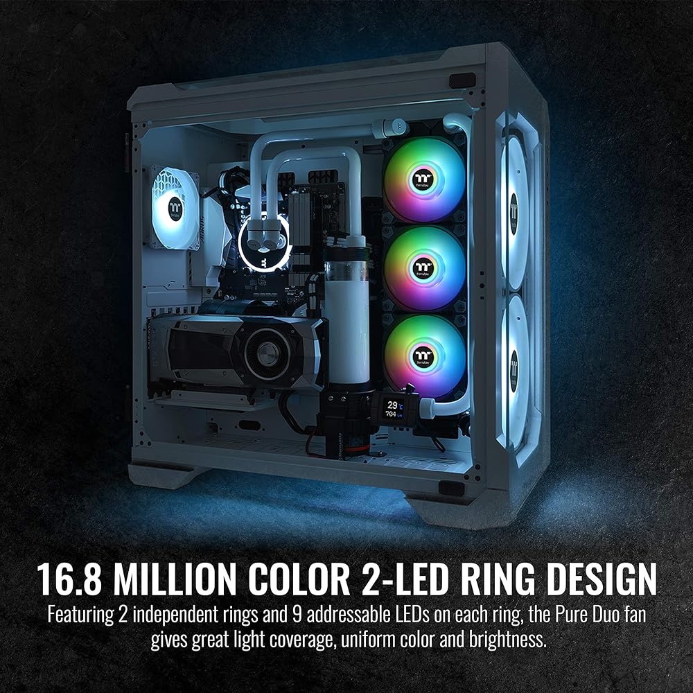 تتميز مروحة المبرد المزامنة Thermaltake Pure 20 ARGB TT Premium Edition بشفرات ضغط ومحمل هيدروليكي وحلقة LED 16.8 مليون لون مع 9 مصابيح LED قابلة للتوجيه وجاهزة للمزامنة مع اللوحات الأم التي تدعم 5V RGB من Asus وGigabyte وMSI والصخور. يمكن للمستخدمين تبديل تأثيرات إضاءة RGB بسهولة باستخدام وحدة التحكم ARGB المضمنة في الحزمة، أو عن طريق ASUS AURA Sync، وgigabyte RGB FUSION، وMSI Mystic Light Sync وكبرنامج متعدد الألوان. توفر مروحة المبرد المتزامنة Pure 20 ARGB إضاءة RGB 16.8 مليون لون وتهوية لا مثيل لها.