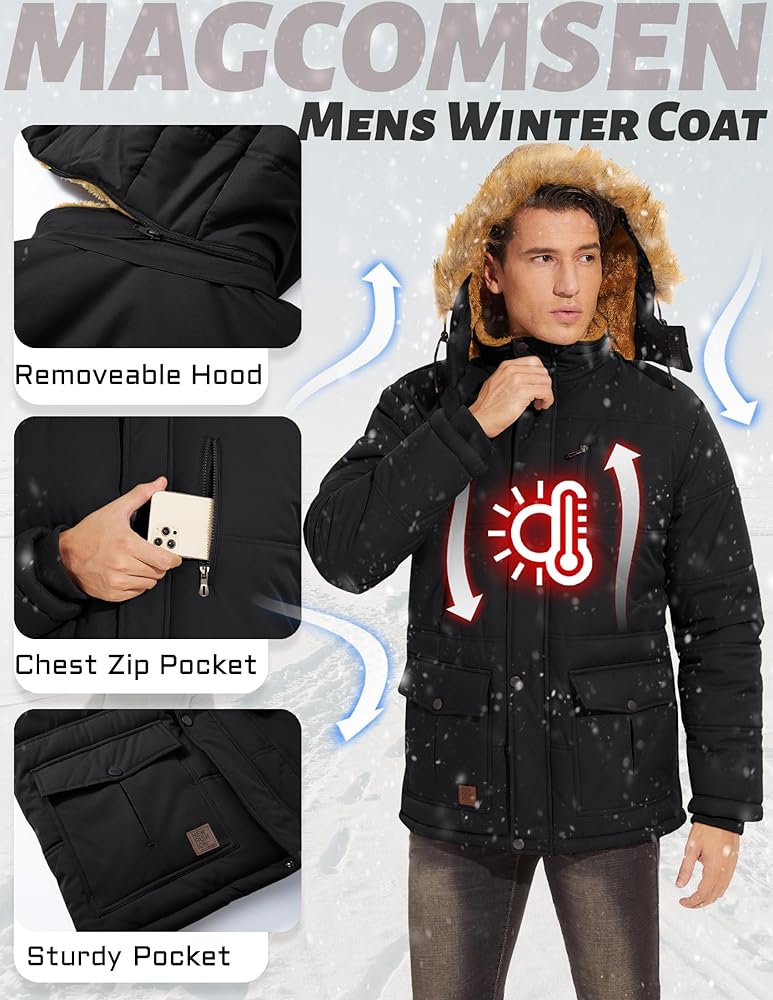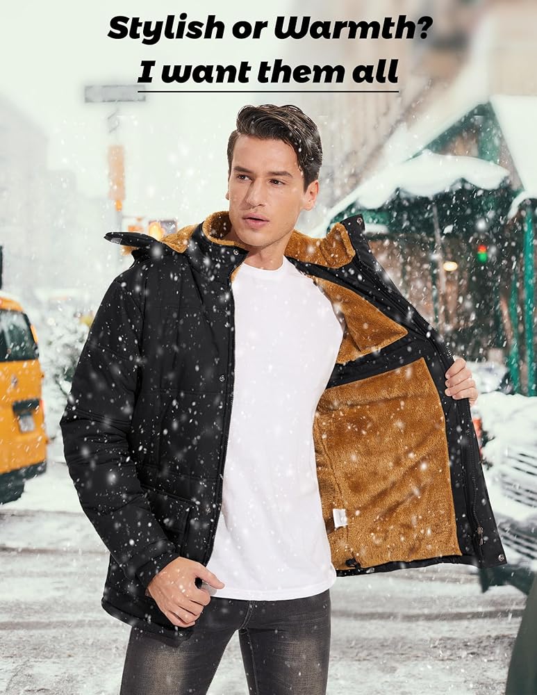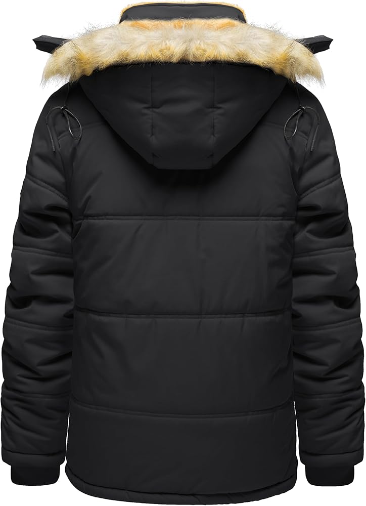 This Mens Winter Puffer Jacket Features Button & Zip Closure, Stand Collar, Detachable Faux Fur Surrounding The Hood