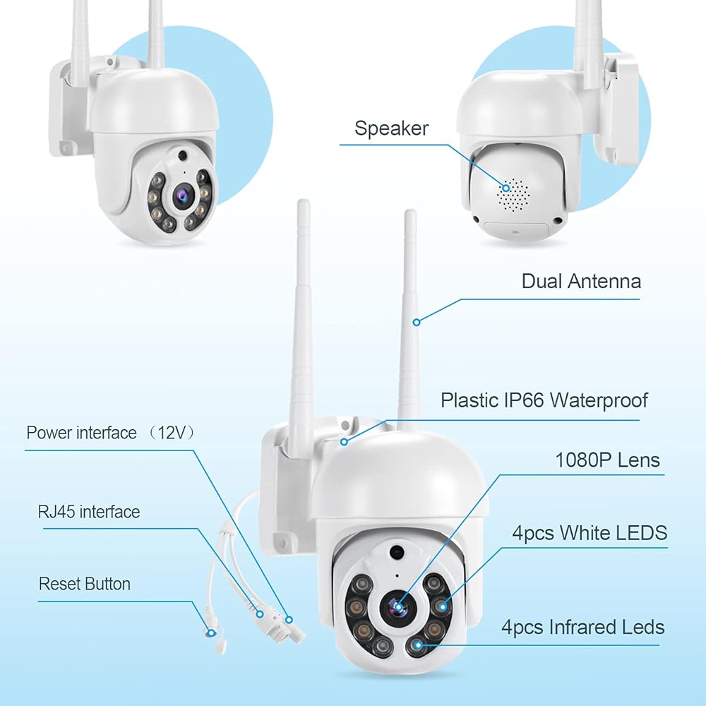 رؤية ليلية ذكية كاملة الألوان: باستخدام 8 قطع من مصابيح LED (4 قطع IR led + 4 قطع LED كاملة الألوان)، مسافة الأشعة تحت الحمراء 150 قدمًا، مسافة رؤية ليلية كاملة الألوان 100 قدم، تطبيق الهاتف المحمول يمكنك إعداد رؤية ليلية ذكية، رؤية ليلية بالأشعة تحت الحمراء، ورؤية ليلية أوتوماتيكية ذكية 3 أوضاع. تصميم مقاوم للعوامل الجوية بمستوى IP66 يتركك خاليًا من القلق بشأن المطر.