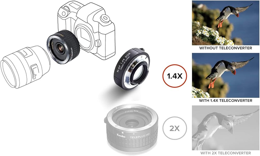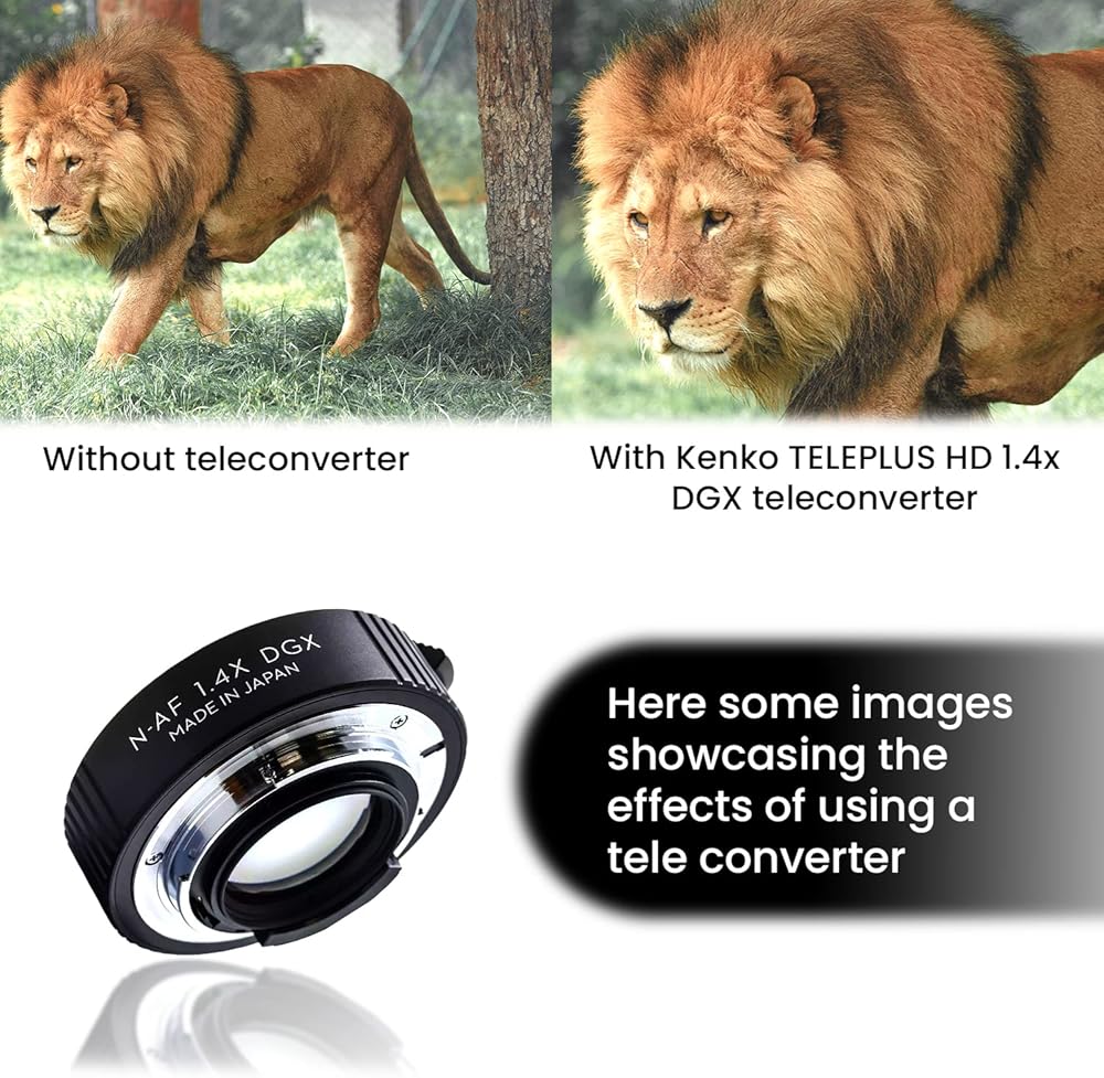 يتم وضعه بين جسم الكاميرا والعدسة، ويحتوي المحول عن بعد على مجموعة من البصريات التي ستزيد بشكل فعال من البعد البؤري لأي عدسة يتم استخدامها بها. محول تيليبلس اتش دي دي جي اكس 1.4X من كينكو له تأثير ضرب البعد البؤري لعدستك بمقدار 1.4X، وتحويل عدسة 300 ملم إلى ما يعادل 420 ملم. تحتوي محولات HD DGX 1.4X على مصفوفة بوابة IC أصلية (دائرة مدمجة). وهذا يعني أن الدائرة الفريدة للمحول تحافظ على سلامة الإشارة بين جسم الكاميرا والعدسة. التصميم المكون من 3 5 عناصر مصنوع من زجاج بصري متعدد الطبقات عالي الجودة مقدم من شركة هويا، أكبر مصنع للزجاج البصري في العالم. يمكن تشغيل التركيز التلقائي الكامل مع تيليبلس اتش دي دي جي اكس 1.4X لنيكون باستخدام عدسة كاميرا بفتحة عدسة مفتوحة F4 أو أكثر سطوعًا. يرجى العلم أن التركيز التلقائي لن يعمل بشكل صحيح إلا إذا كان هناك ما يكفي من الضوء والتباين على الهدف لتنشيط مستشعرات التركيز التلقائي للكاميرا بشكل صحيح. (قد يكون التركيز اليدوي ضروريًا عند استخدام العدسات ذات القيم المفتوحة الأصغر من تلك المذكورة أعلاه. تحتوي محولات تيليبلس اتش دي دي جي اكس على دوائر محدثة لتسجيل بيانات الخروج بدقة أكبر في بيانات التعرض للخروج (البيانات الوصفية المسجلة مع صورة رقمية) تسجل محولات تيليبلس اتش دي دي جي اكس الفتحة المكافئة والبعد البؤري لإعداد العدسة بالإضافة إلى محول عن بعد. بصريًا وميكانيكيًا متطابقة مع محولات تيليبلس اتش دي دي جي اكس السابقة عالية الجودة. تم تحسين أداء العدسة بشكل كبير مقارنة بنماذج MC4 وMC7. التحسن في الدقة ملحوظ بشكل خاص، 150% على التوالي بالمقارنة مع طراز MC4 الحالي.