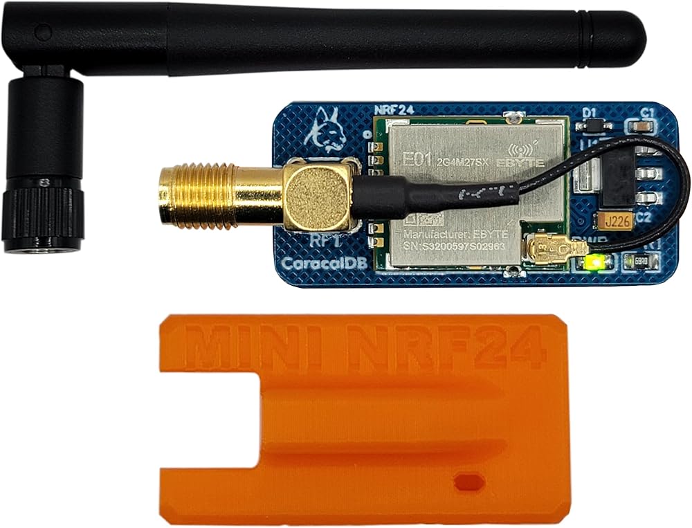 The Mini NRF24 board plugs directly into the Flipper Zero's GPIO pins and adds NRF24 functionality. Includes 2.4GHz Antenna and 3D printed case. Requires third party firmware to operate.