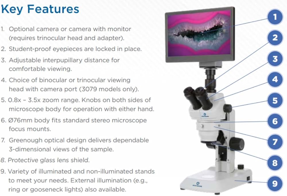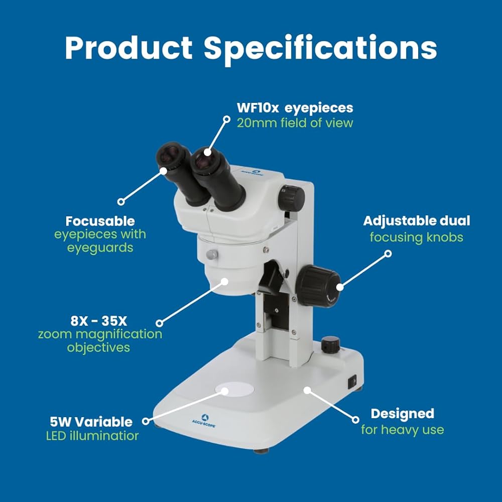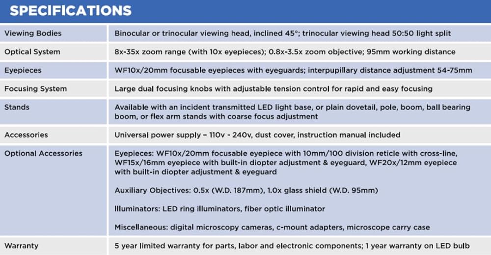 CRISP IMAGES AT 8X-35X|| The Stereo Microscope is designed for years of dependable observation. It comes equipped with a Greenough optical system; 8-35X zoom magnification; and variable LED incident and transmitted illumination to deliver sharp, high resolution, 3-dimensional views of your samples