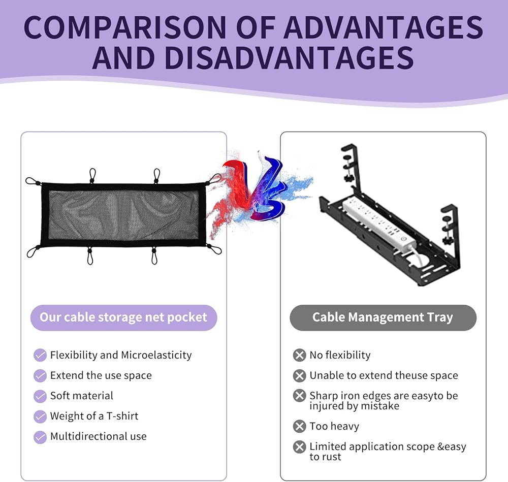 【مقارنة】صينية إدارة الكابلات التقليدية تحت المكتب: لا توجد مرونة، غير قادرة على تمديد مساحة الاستخدام، حواف الحديد الحادة سهلة الإصابة عن طريق الخطأ، ثقيلة جدًا، تستخدم في اتجاه ثابت. [شبكة إدارة الكابلات تحت المكتب] -- المرونة والمرونة الدقيقة، يمكن أن تزيد من مساحة الاستخدام، مادة ناعمة، وزن التي شيرت، استخدام متعدد الاتجاهات.