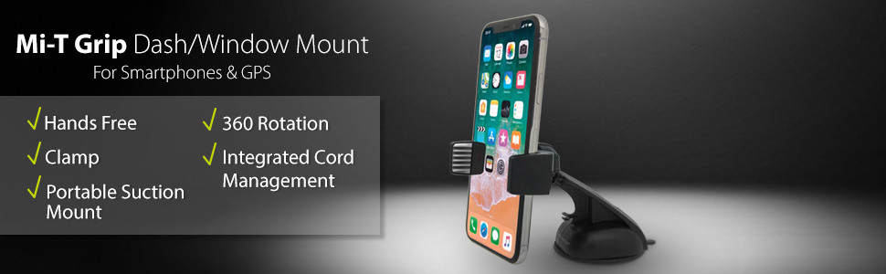 Bracketron supports hands free driving. Mount your phone for the safest driving experience. Customer Satisfaction is our #1 priority! If you ever have an issue with your mount, please contact us at tech@bracketron and we would be happy to assist you. The newest version of Bracketron's Mi-T Grip Dash/Window Mount features flexible contoured rubber on the inside of the head to allow for easier one handed mounting and removal of your smartphone. You can just pull the spring loaded arms apart and place your mobile device in while still having full access to all device controls. We also added a cord clip to hold your charging cable in place so it doesn't get in the way of you driving. The base has our Tempo bond material. 360° rotating head adds even more versatility to the Mi-T Grip holder, allowing easy mounting in any orientation you prefer, while providing a secure base. This mount is transferrable between vehicles, release the suction lever and use your fingertips to break the seal between the dash and the tempo bond gel. Before reapplying in a new spot, make sure to clean the suction base with water and allow it to air dry.