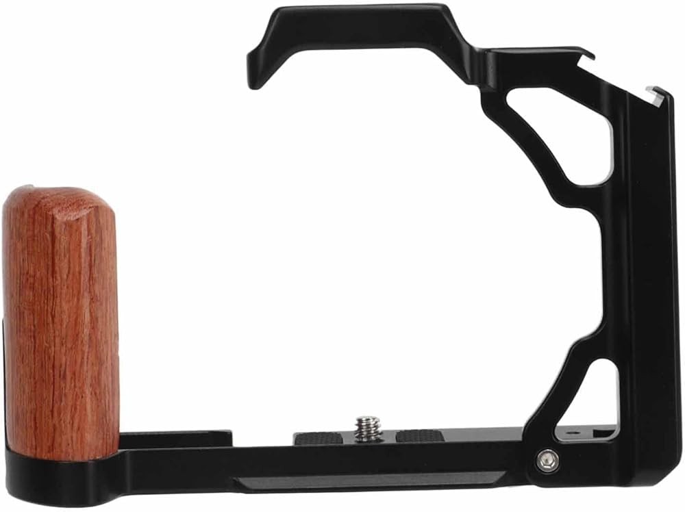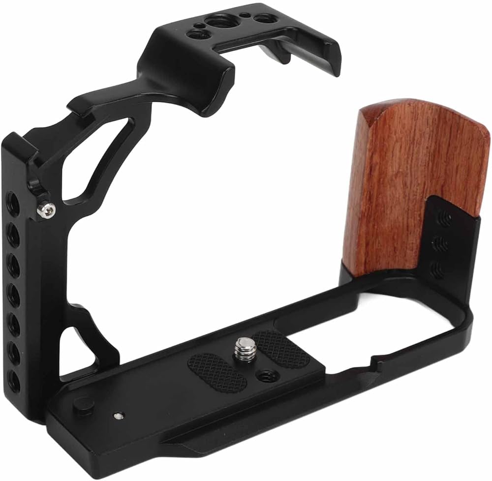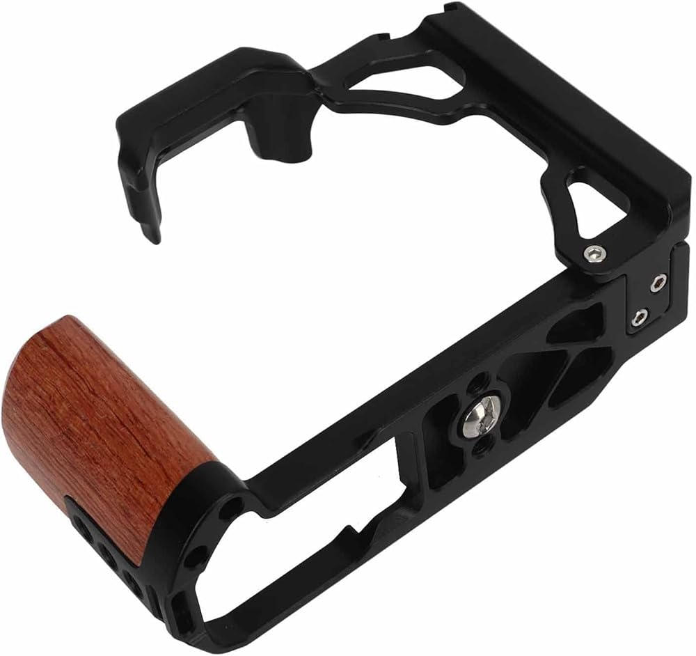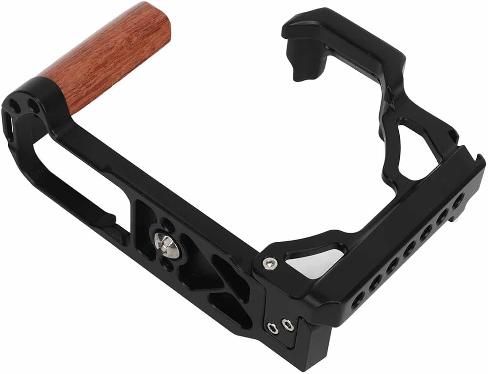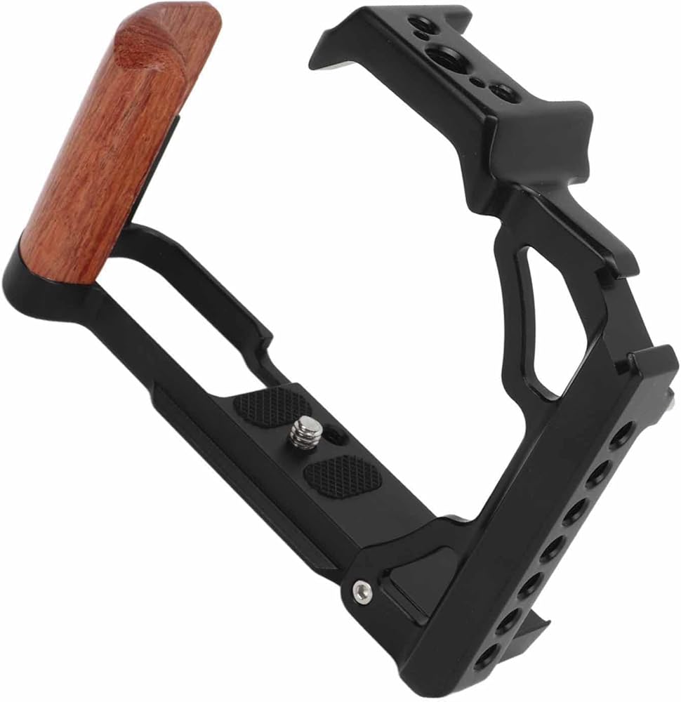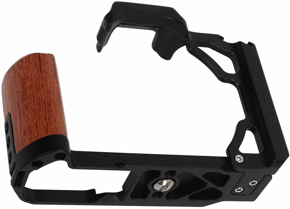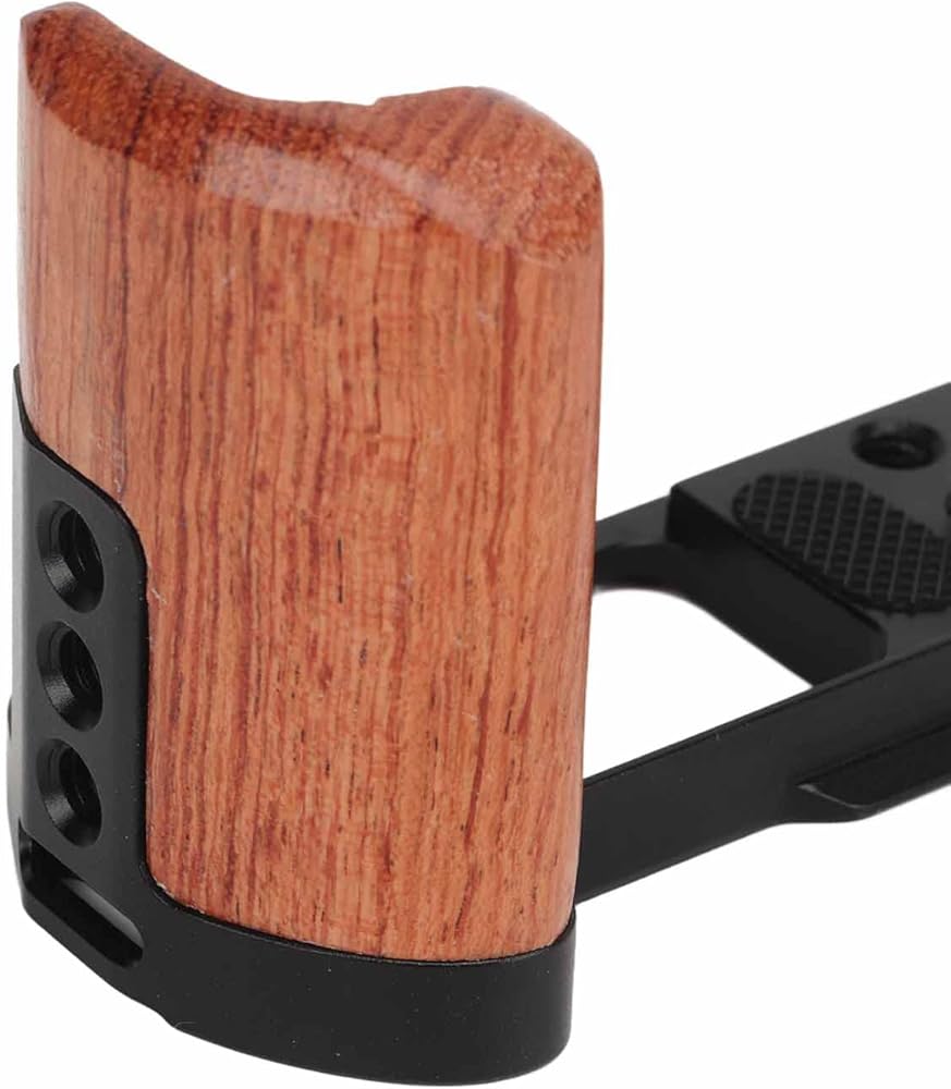 【Cold Shoe Mount and Wood Handle】Wooden handle camera cage is equipped with a cold shoe mount for fixing compact video lights or microphones. The handle is made of wood for comfortable grip.