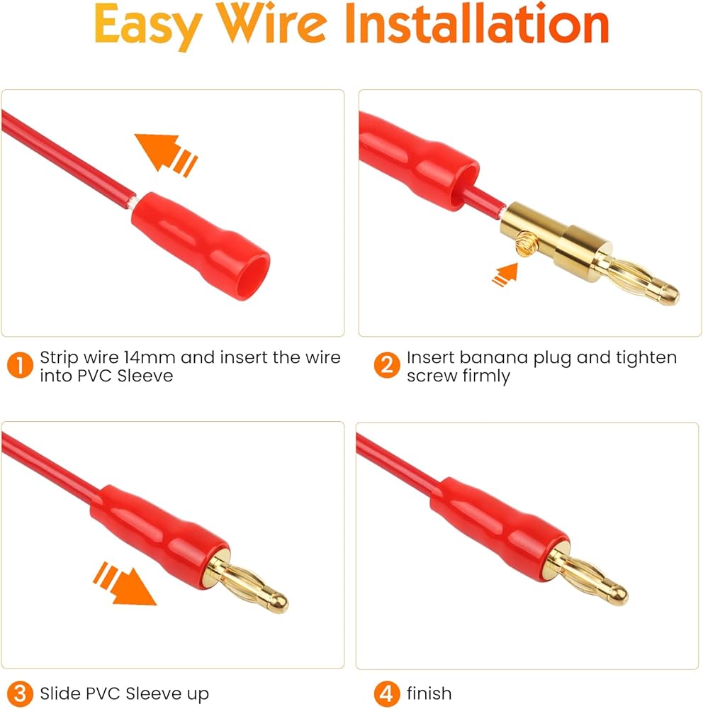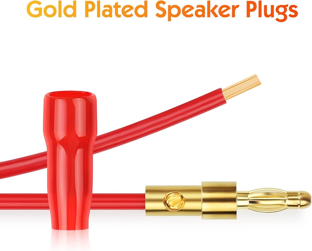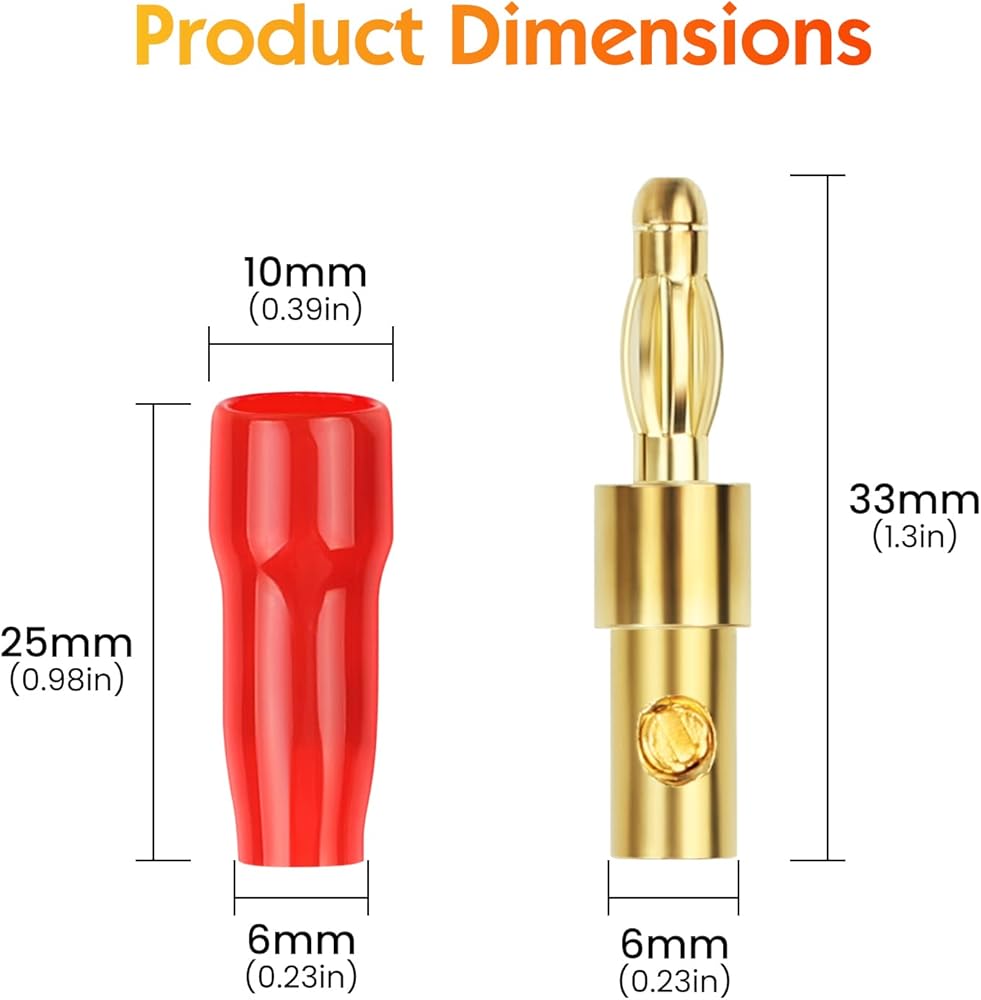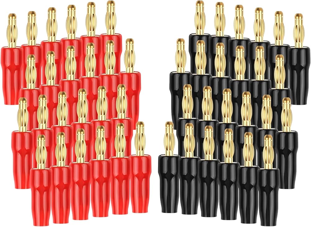 تأتي المقابس أيضًا بلونين مختلفين، الأحمر والأسود، مما يساعد على الإشارة إلى القطبية المناسبة. تتضمن العبوة ما مجموعه 48 قابس موز، مع 24 قطعة باللون الأحمر والآخر 24 قطعة سوداء. يأتي كل قابس أيضًا مع مجموعة البراغي الخاصة به لربط سلك مكبر الصوت.