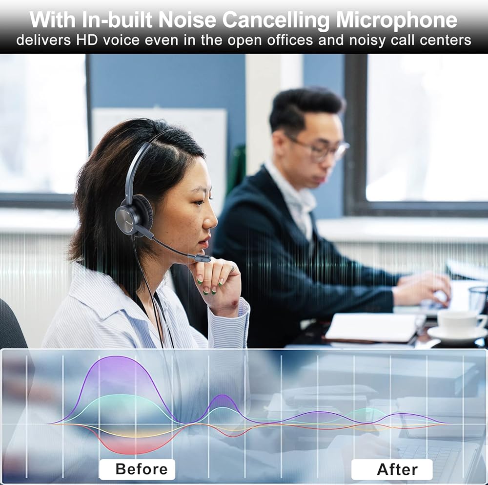 A professional communication headset provides clear voice transmission during phone calls. Wide band audio and feature with noise canceling microphone to filter out most background noise. Its excellent sound quality gives users the feeling they're having a "face to face" communication.