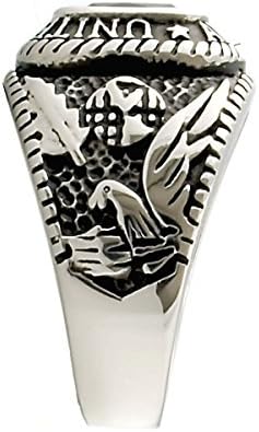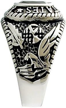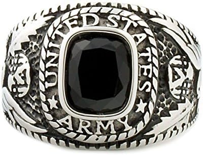 Hood: If you've been looking for a ring that symbolized your pride in and commitment to the US Army that is both affordable and durable, then look no further! This rugged and handsome design is made with solid 316L Stainless Steel, so you can be confident that it's made to last (no cheap, plated ring here). The design features the traditional faceted Simulated Black Onyx solitaire bordered by the words United States Army. Both sides have an eagle and globe symbolizing the support of freedom.