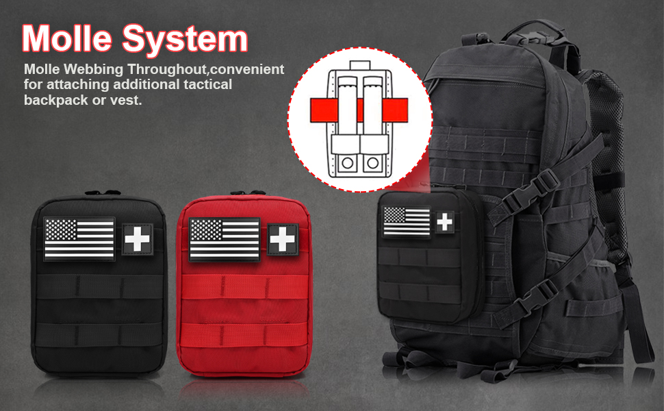 • نظام MOLLE: تأتي المجموعة الطبية التكتيكية مع نظام MOLLE وأشرطة نايلون متينة وإبزيم نحاسي قوي يمكن ربطه بأجهزة أخرى متوافقة مع MOLLE مثل الحزام أو حقيبة الظهر أو السترة التكتيكية أو وضعها في سيارتك كحقيبة أدوات الإسعافات الأولية للسيارة .