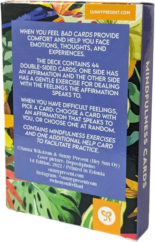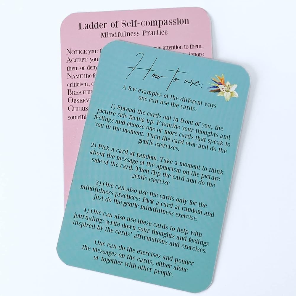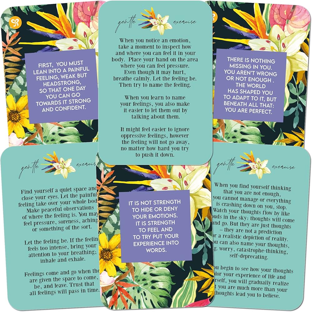 A structured approach to dealing with emotions: The 2 extra cards provide a 5-step process for self-compassion and a reference list of difficult emotions.