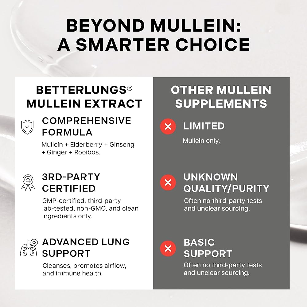 • MULLEIN LEAF LUNG SUPPORT - BetterLungs taps into the natural properties of Mullein Leaf Extract, a traditional herbal known for over centuries for its powerful benefits in respiratory tract and overall lung health. Experience easier breathing, improved lung function, and a renewed sense of vitality.
