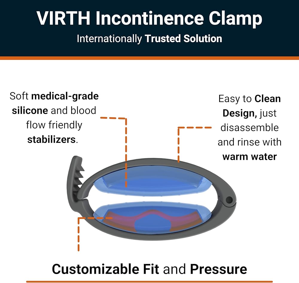 مشبك سلس البول Virth هو جهاز طبي خارجي يستخدم لتنظيم تسرب البول. يضغط الجهاز على مجرى البول، مما يحد من تدفق البول. يقوم المستخدم بوضع القضيب بين الوسائد، وتركز السنام الموجود في الجانب السفلي من الإطار الضغط في مجرى البول، وينظم تدفق البول، بينما يهدف النصف العلوي من الإطار إلى تحرير الضغط، مما يتيح الدورة الدموية المناسبة والراحة المثلى.