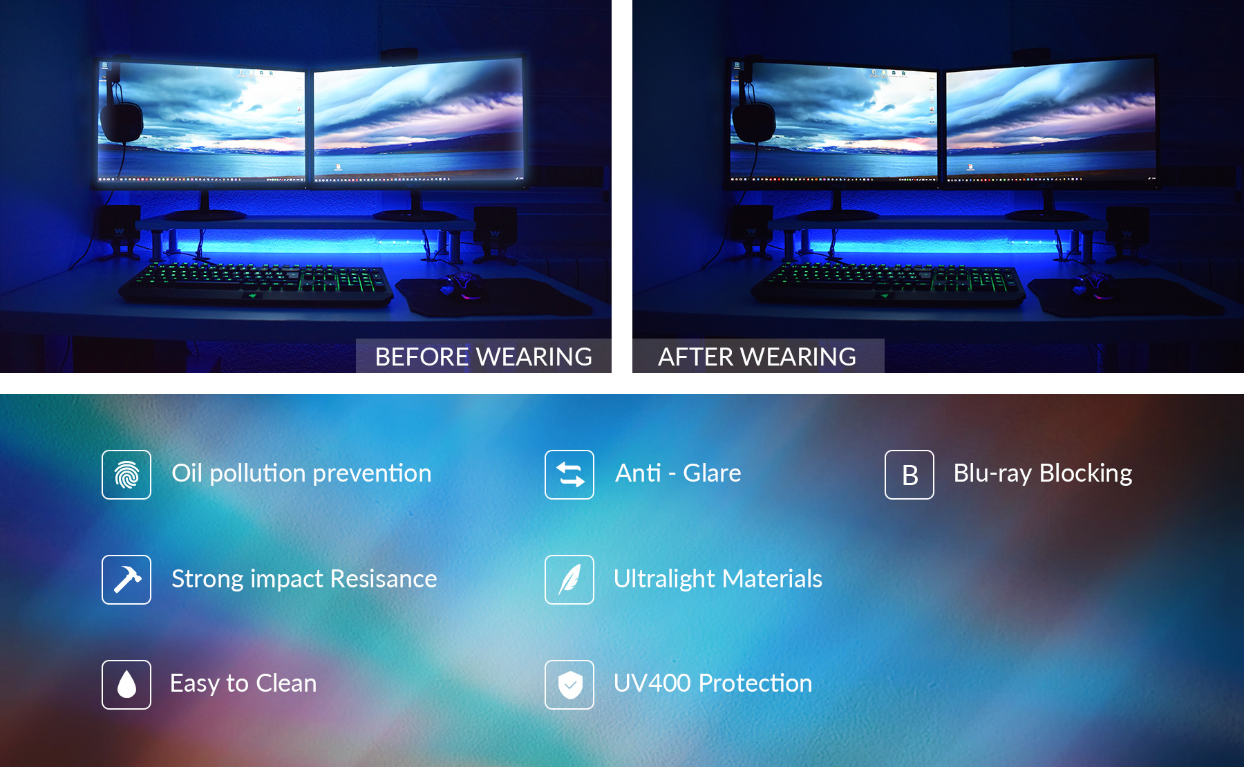 [نظارات بلوكز بلوكز بلوك]: على عكس عدسات الضوء الأزرق التقليدية، فإن عدسات زين بلوكز مصنوعة من مواد تضم بوليمر خاص يحجب الضوء الأزرق والذي يعمل على تصفية الأشعة فوق البنفسجية الضارة والضوء الأزرق من الشاشات الرقمية والضوء الاصطناعي والشمس.