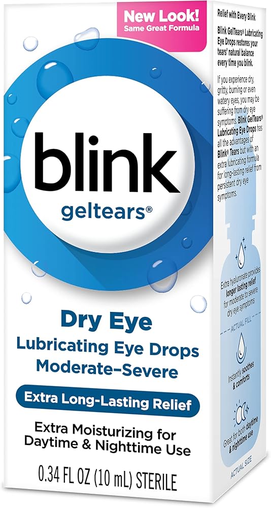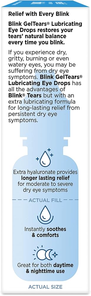 Blink Gel Eye Drops provide long-lasting relief from dry eye irritation. By adapting to your eyes' needs, these lubricating eye drops restore your tear film with every blink to soothe your dry eye symptoms. Ideal for moderate to severe dryness, these eye drops can be used during both the day and night.