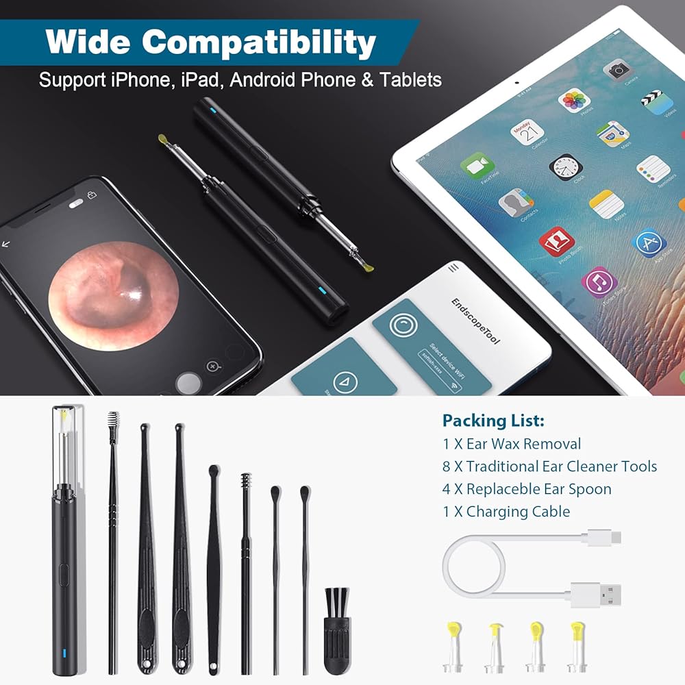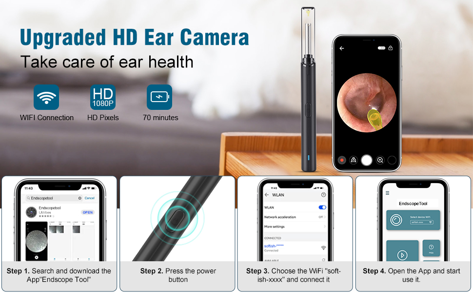سهلة التركيب: أولاً، ابحث عن تطبيق "Endscope Tool" في متجر التطبيقات أو Google Play وقم بتنزيله. ثانيًا، اضغط على زر الطاقة الموجود في كاميرا أداة إزالة شمع الأذن. ثالثًا، اختر شبكة WiFi “softish-xxxx” للاتصال. (ملاحظة: يرجى تمكين إذن الشبكة لهذا التطبيق.) رابعًا، ابدأ بمشاهدة الفيديو في الوقت الفعلي أثناء استخدام أداة إزالة شمع الأذن. تم تصميم شبكة WiFi فقط لهذا المنتج، ولن تدعم الإنترنت الأخرى ولن تصل أبدًا إلى أي خصوصية. لا تتردد في استخدامها.